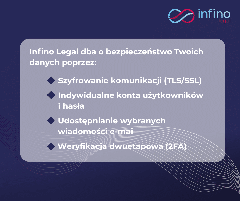 - Infino Legal oferuje weryfikację dwuetapową, zawsze ją aktywuj. To dodatkowa warstwa zabezpieczeń, która znacząco zwiększa bezpieczeństwo Twojego konta.