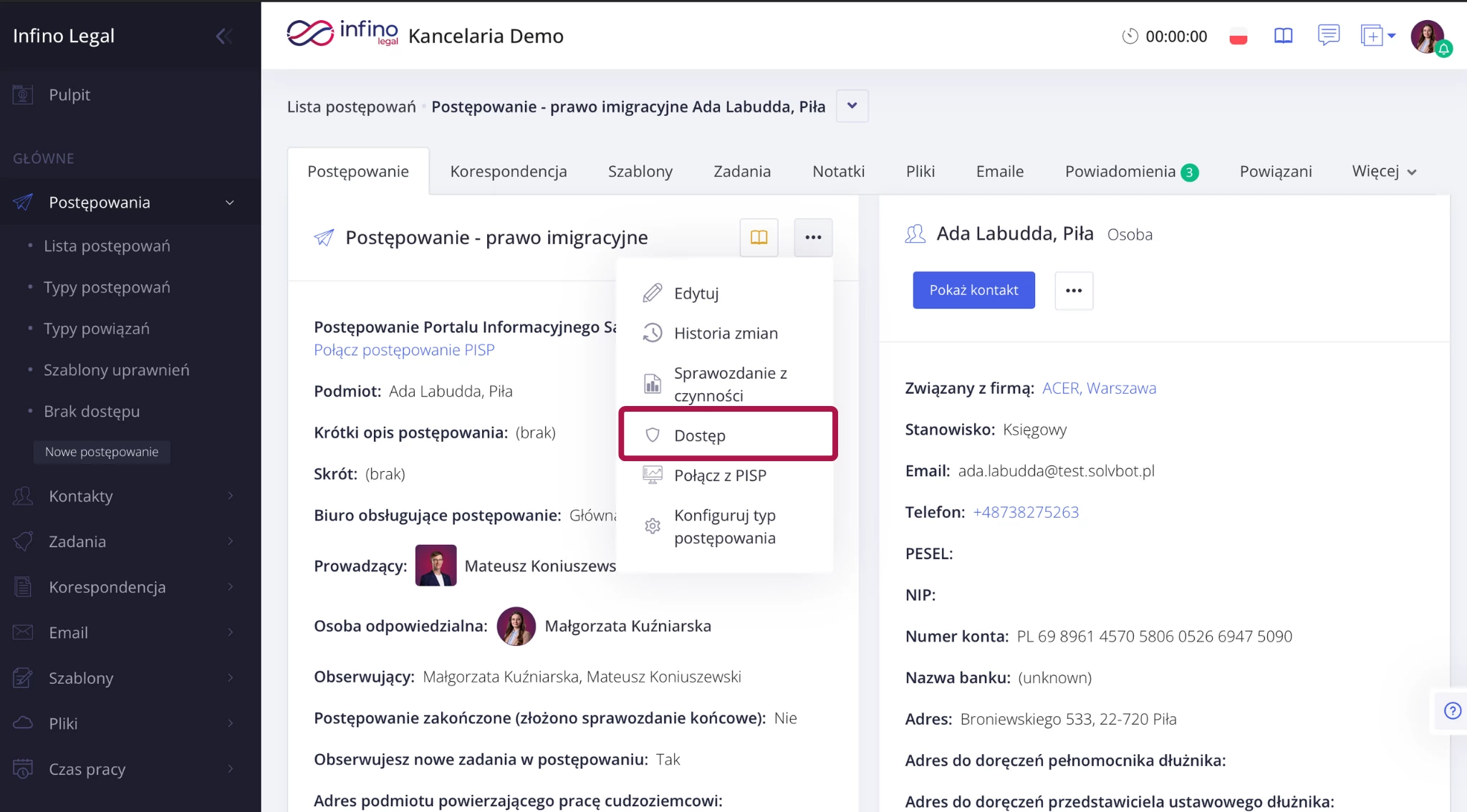 2. W zakładce Postępowanie, obok nazwy typu postępowania kliknij trzy kropki i wybierz Dostęp. Lista użytkowników przypisanych do szablonu uprawnień w Infino Legal.
