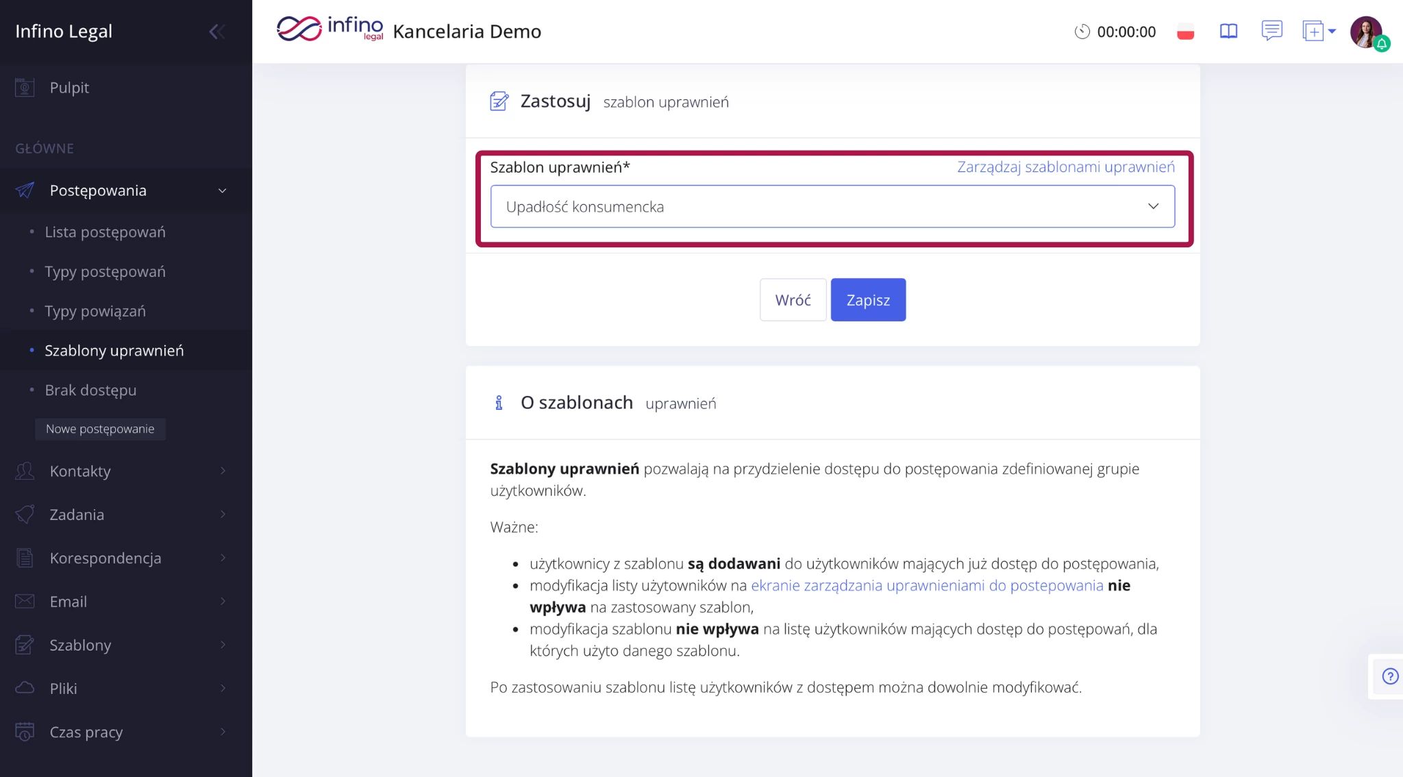 Pamiętaj, że szablon „nie synchronizuje się” wstecz – zmiany w szablonie nie zmienią automatycznie dostępu w sprawach, w których został już użyty.