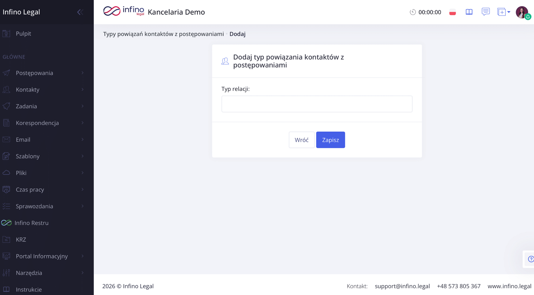Infino Legal – formularz dodawania typu powiązania z polem „Typ relacji” i przyciskiem „Zapisz”.