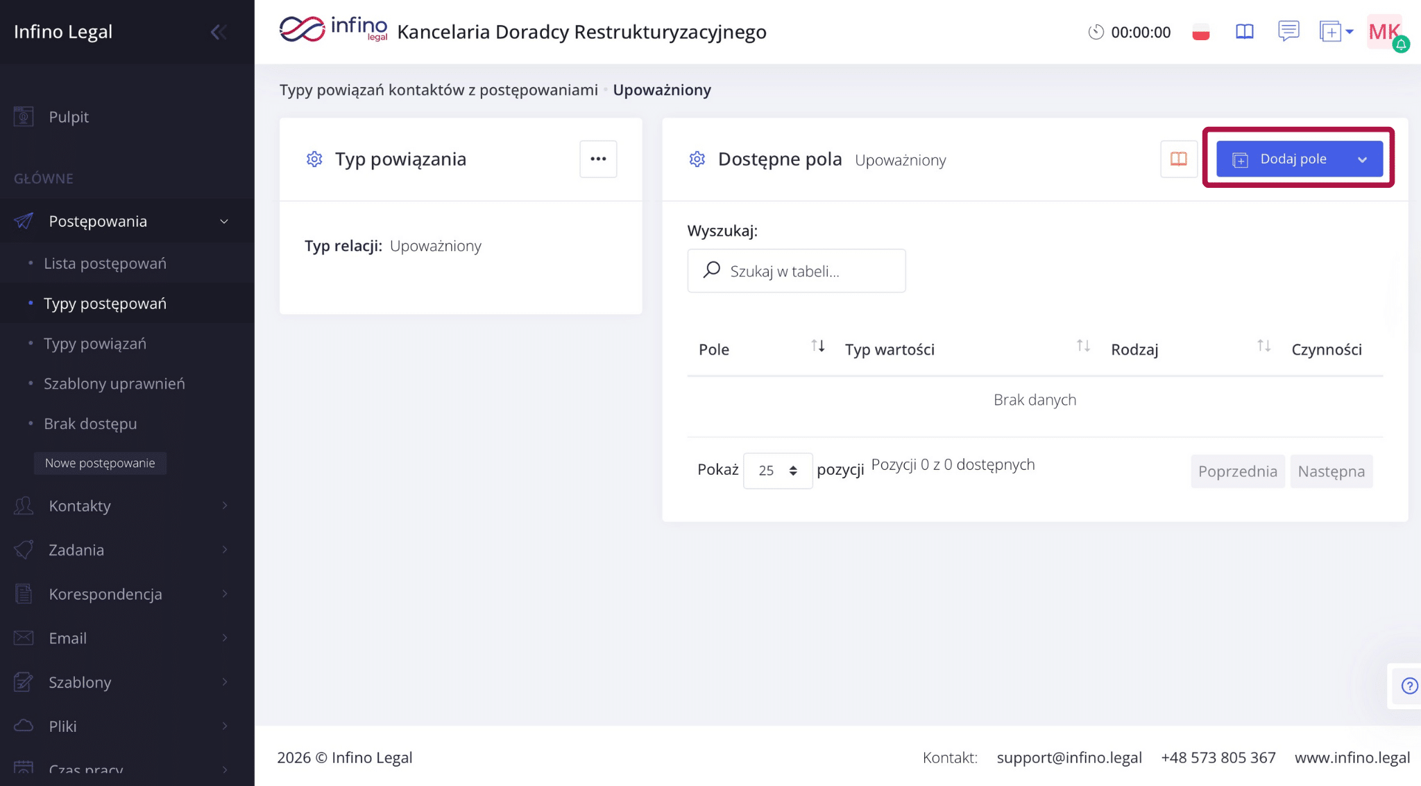 Infino Legal – widok typu powiązania z sekcją „Dostępne pola” i przyciskiem „Dodaj pole”.