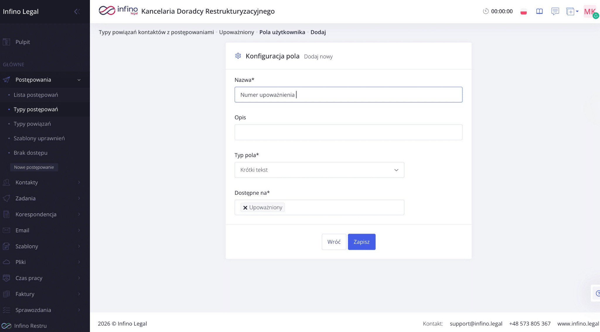 Żeby ułatwić Ci pracę na powiązanych kontaktach, do każdegotypu powiązania możesz dodać własne pola użytkownika. Dzięki temu zbierasz i przechowujesz dodatkowe informacje w jednym miejscu, a system automatycznie poprosi Cię o ich uzupełnienie podczas łączenia kontaktu z postępowaniem. Wprowadzone wartości zobaczysz potem od razu na liście Powiązani w danym postępowaniu. Więcej na temat powiązanych znajdziesz tutaj.