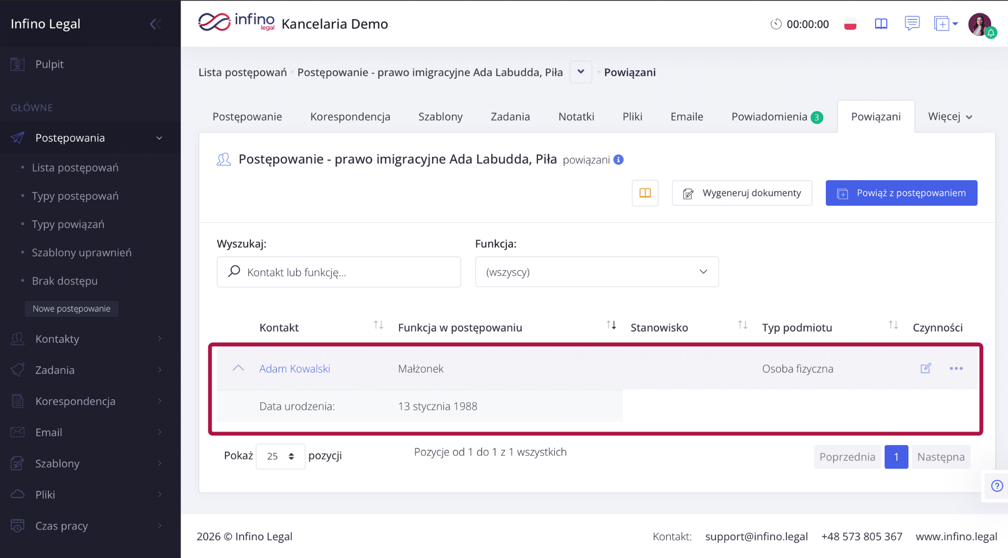 Infino Legal – lista „Powiązani” w postępowaniu: kontakt z rolą oraz wyświetlone dane relacji (pola użytkownika).