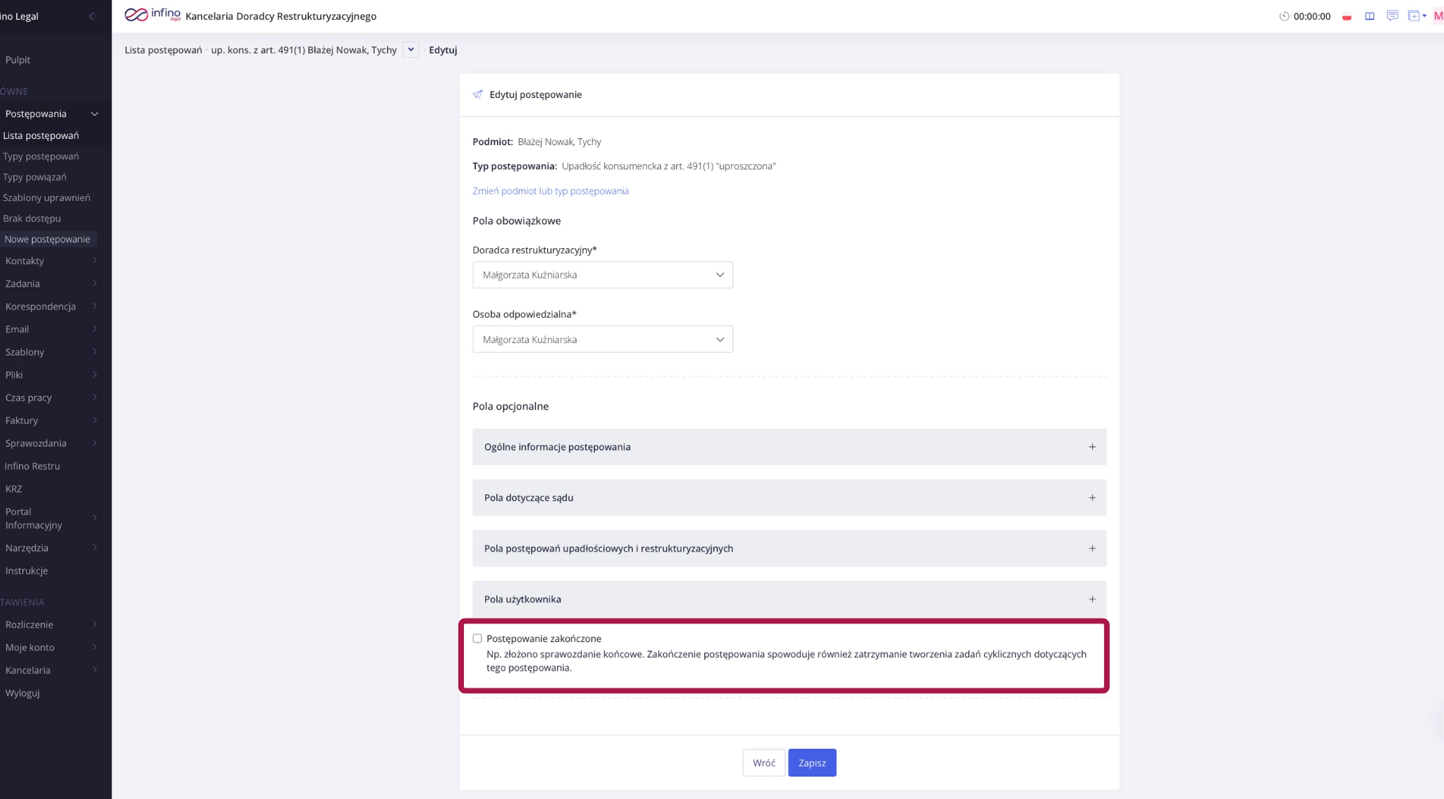 - Na dole formularza zaznacz okno Postępowanie zakończone.