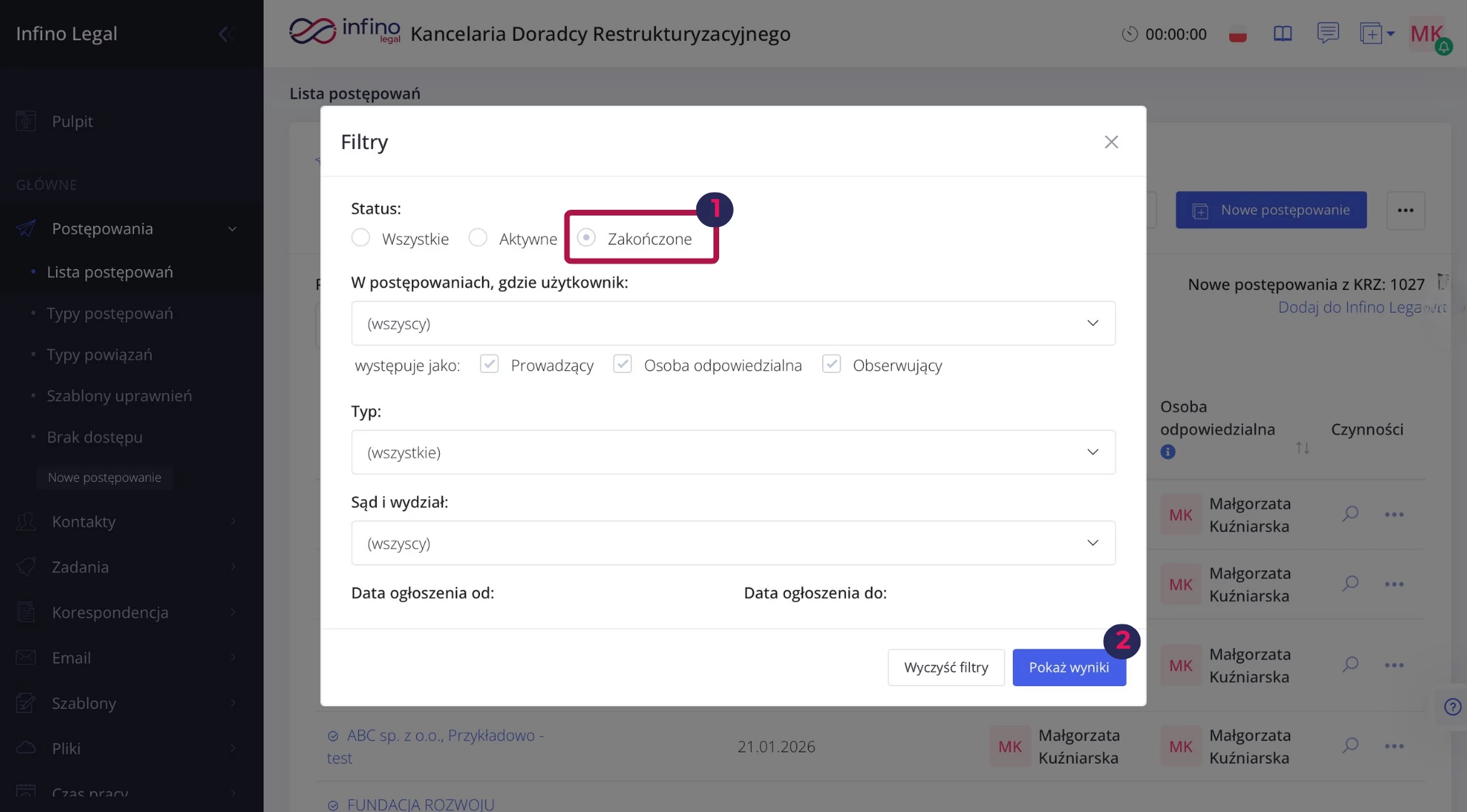 - W razie pomyłki możesz przywrócić sprawę do aktywnych jednym kliknięciem. Wszystkie zamknięte postępowania znajdziesz w jednym miejscu, z którego łatwo możesz wybrać to, które chcesz przywrócić.