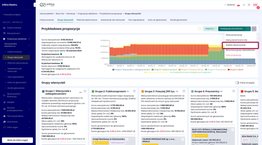 - W propozycji układowej przejdź do zakładki Grupy wierzycieli, a następnie kliknij w trzy kropki i wybierz opcję Szybkie dopasowanie.