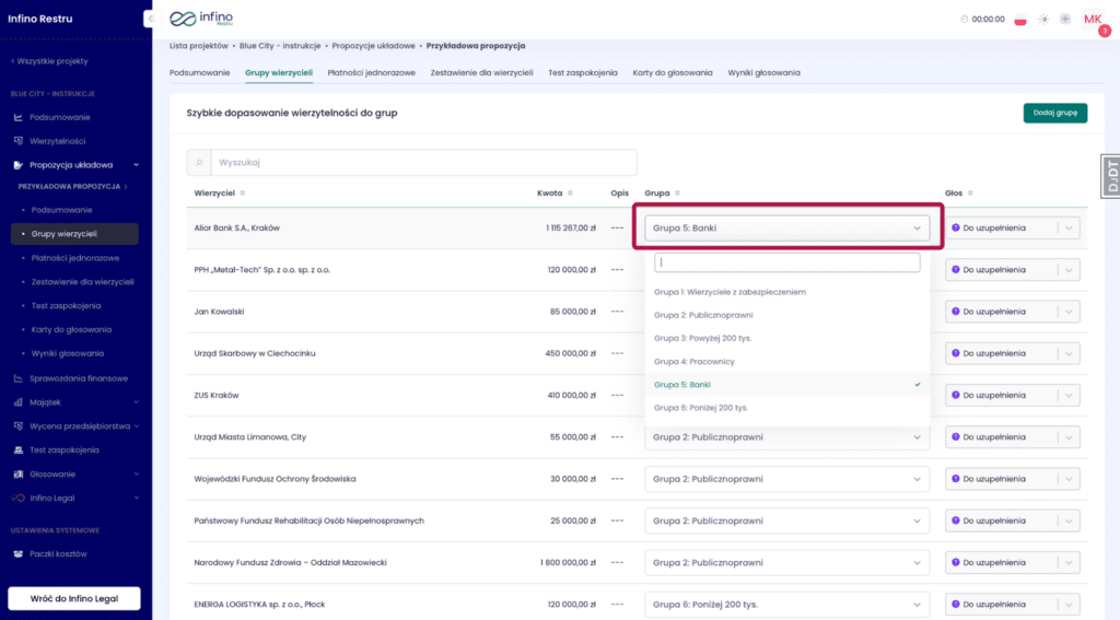 Funkcja pozwala na przypisanie wszystkich wierzycieli do grup z jednego ekranu – zamiast pojedynczego przeciągania. Dzięki temu nie musisz przenosić wierzycieli ręcznie, możesz wybierać grupy z listy rozwijanej dla każdej wierzytelności osobno.