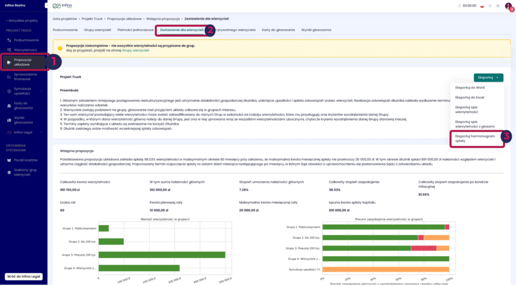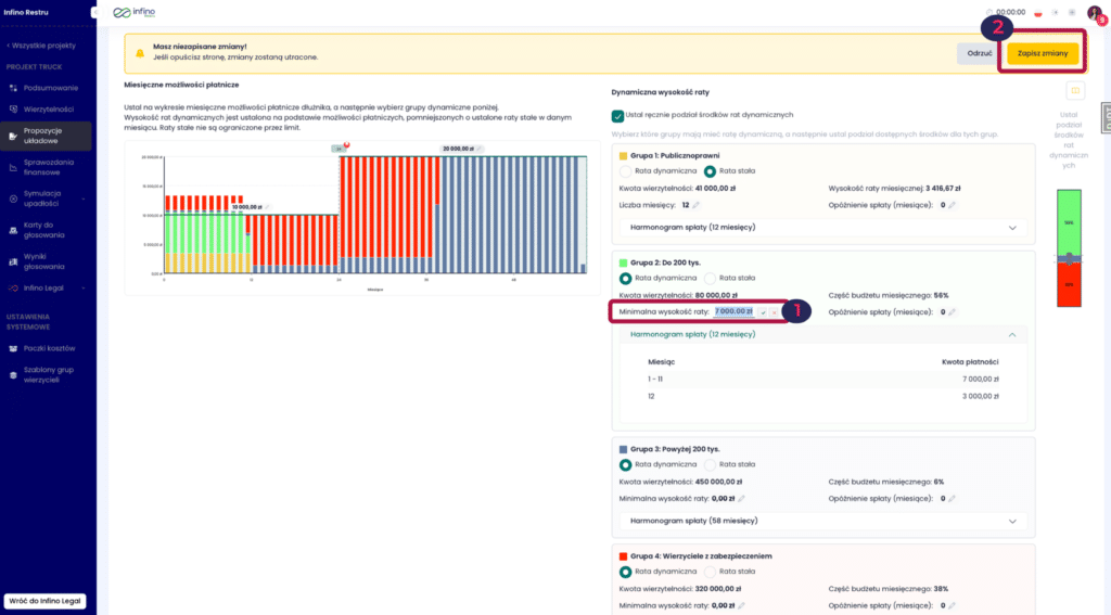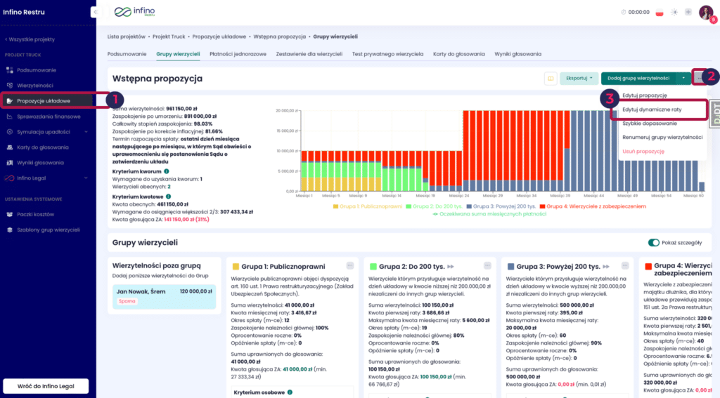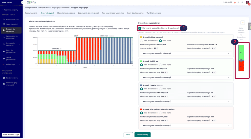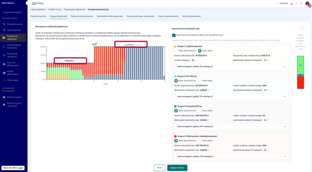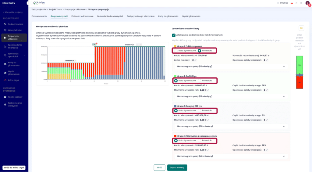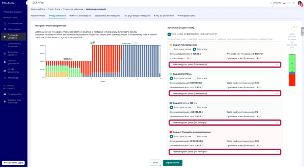 Infino Restru to zaawansowane narzędzie, które rewolucjonizuje proces tworzenia propozycji układowych, umożliwiając automatyczne i dynamiczne dostosowywanie rat do zmieniającej się sytuacji finansowej dłużnika. Dzięki możliwości definiowania rosnących możliwości płatniczych, inteligentnego podziału środków oraz precyzyjnego eksportu harmonogramów, system pozwala na przygotowanie realistycznych i negocjowalnych planów spłaty, które maksymalizują szanse na sukces postępowania restrukturyzacyjnego. Zdefiniuj schodki na zielonej linii, ustaw grupy na ratę dynamiczną, a w razie potrzeby skorzystaj z ręcznego podziału środków i minimalnej raty. System automatycznie przeliczy harmonogramy i ułatwi negocjacje, a Ty w każdej chwili wyeksportujesz pełny plan do Excela.
