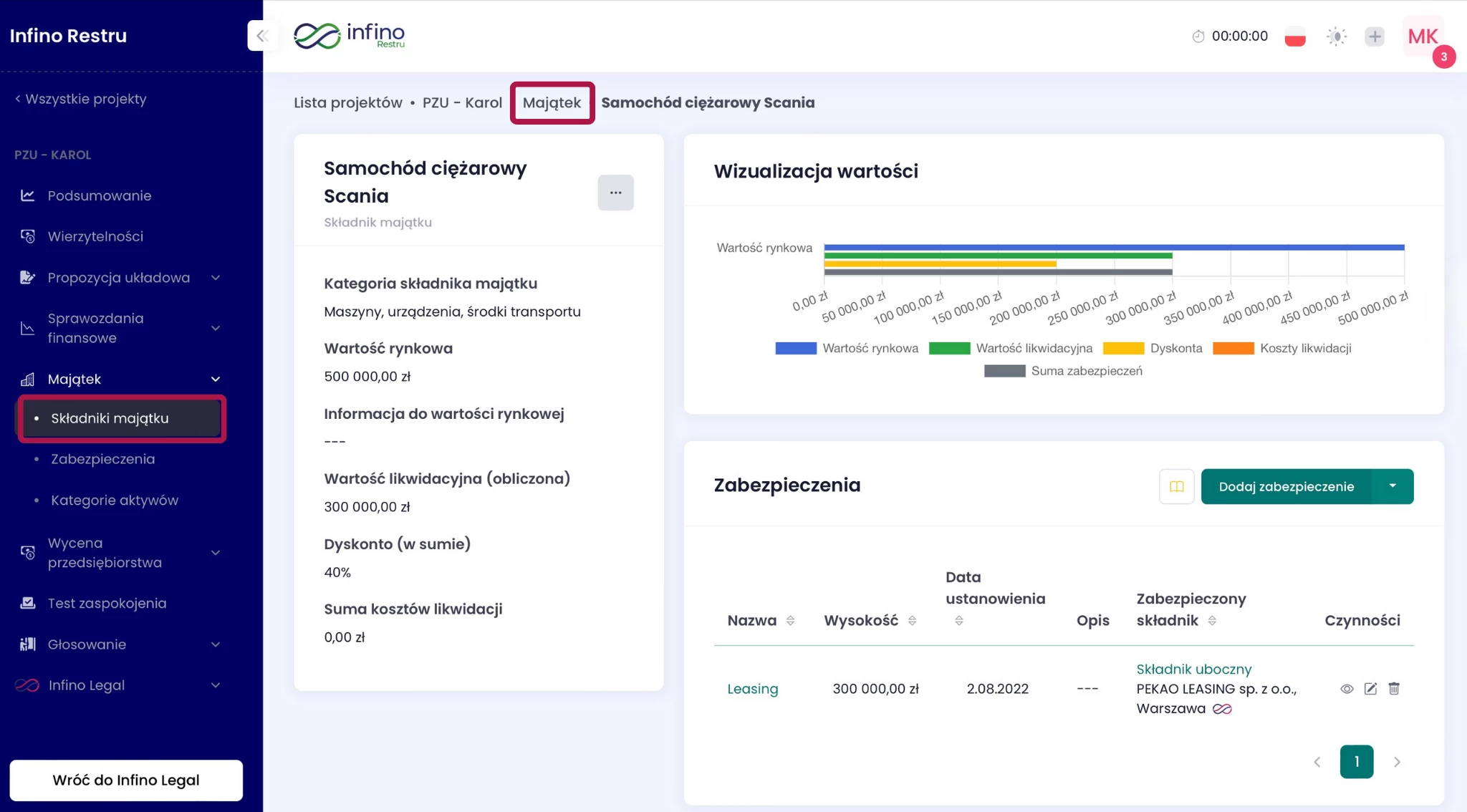 - Kliknij Zapisz w formularzu składnika. System automatycznie przeniesie Cię do ekranu karty składnika majątku, gdzie możesz znaleźć informacje dotyczące wizualizacji wartości, zabezpieczeń, kosztów likwidacji czy dyskont.