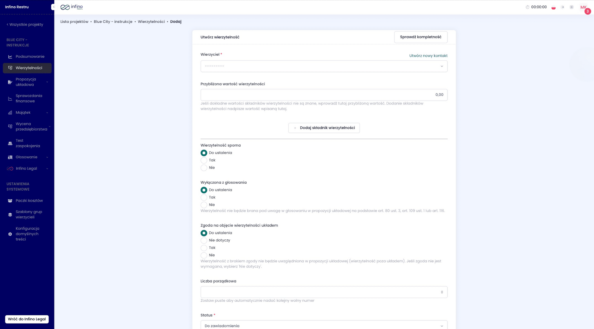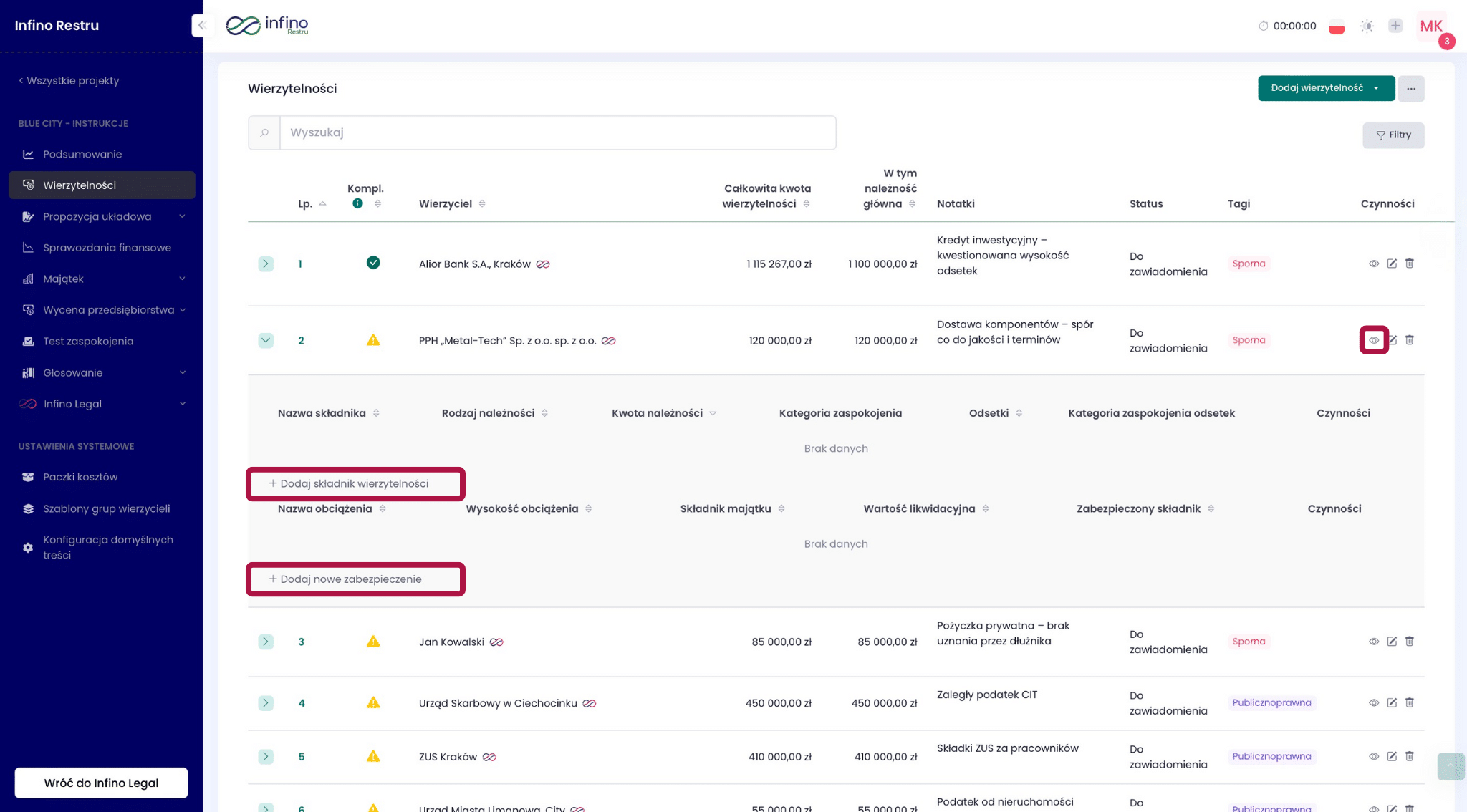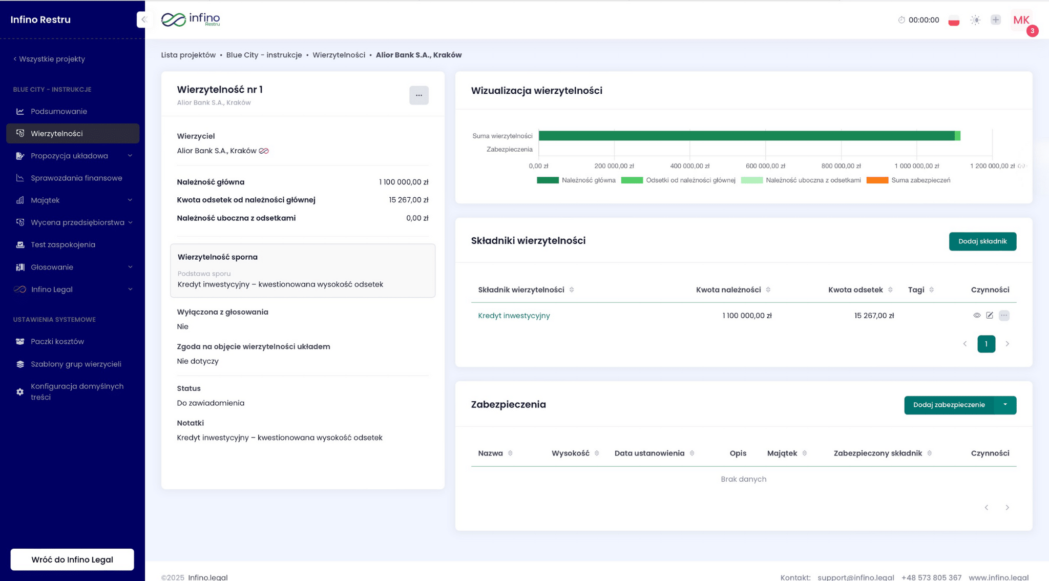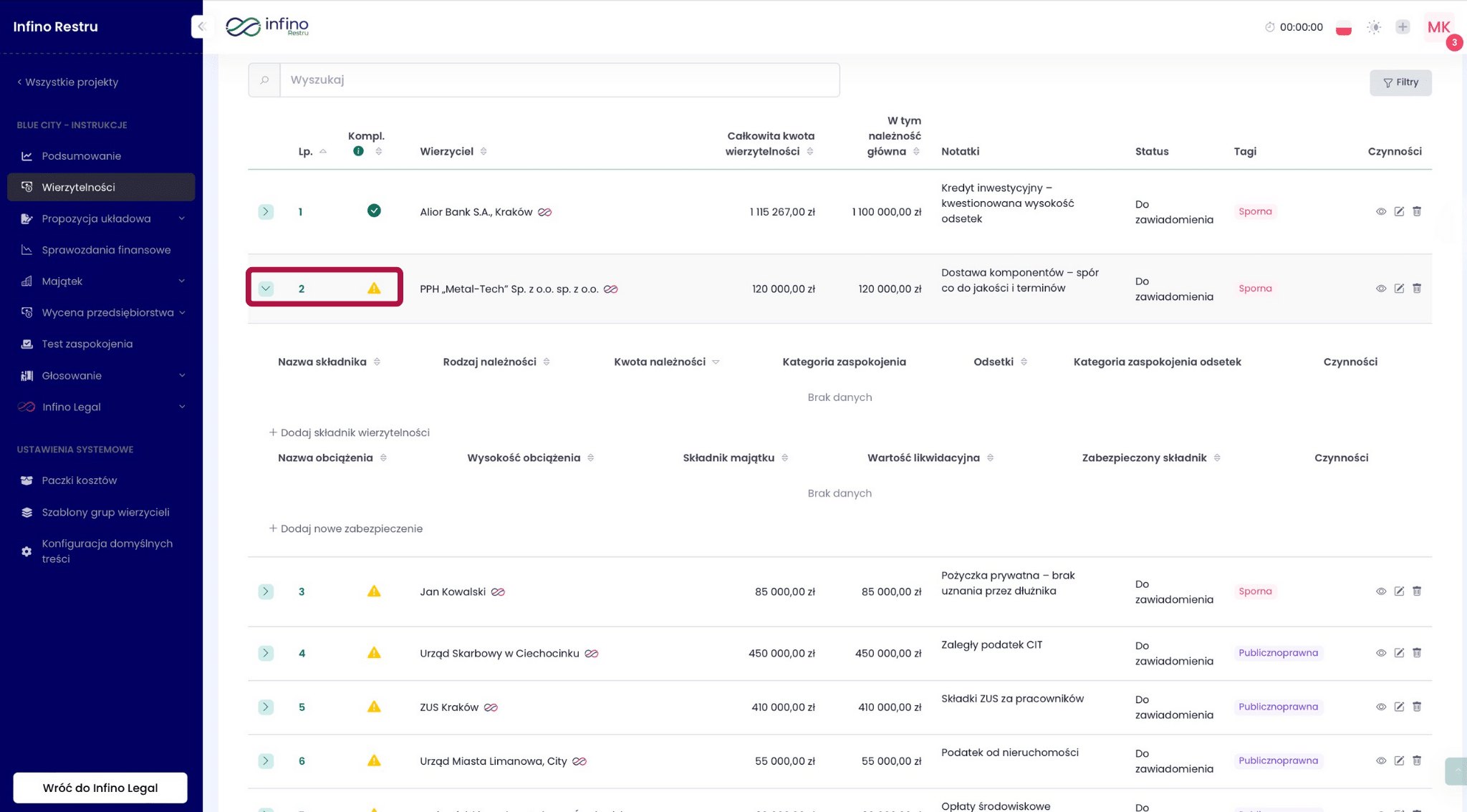 - Otwórz projekt i przejdź do zakładki Wierzytelności.