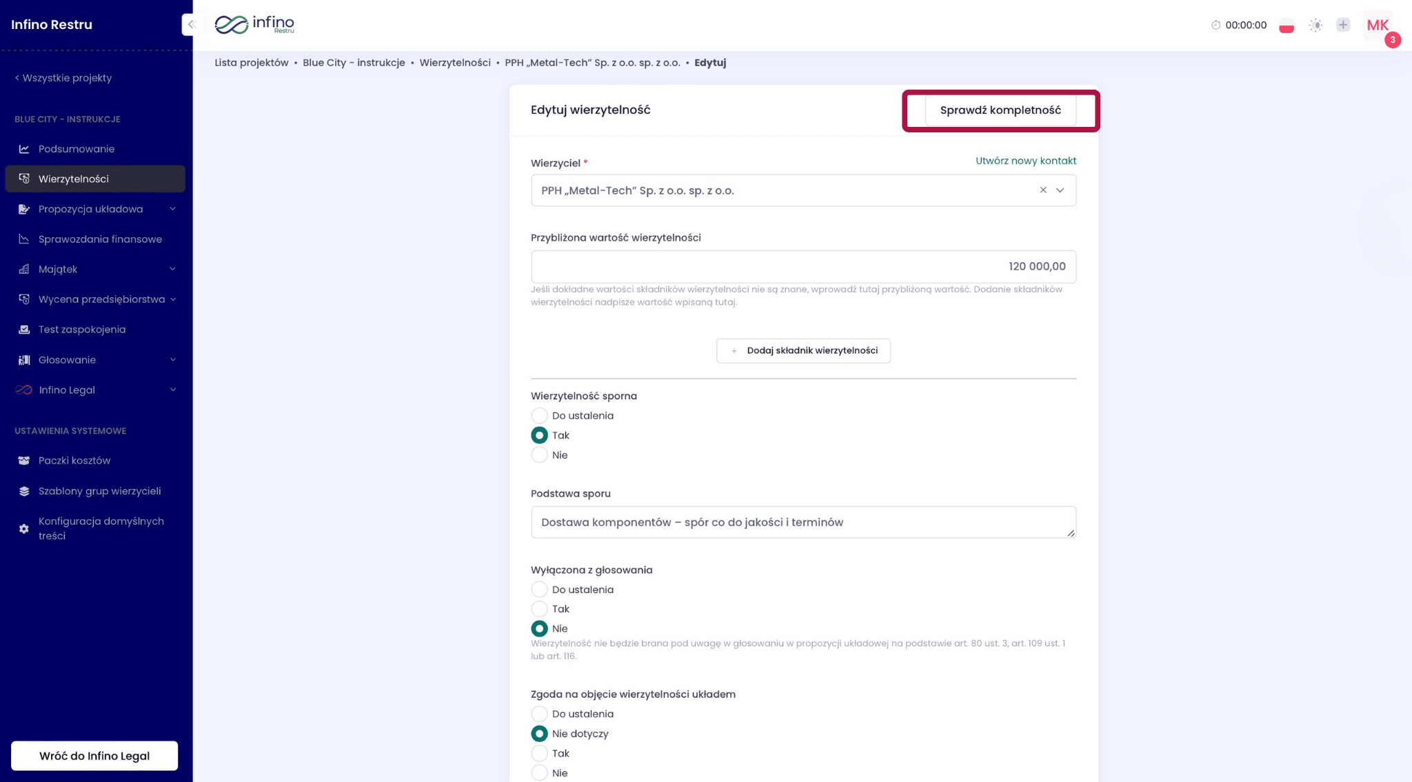 - Wypełnij formularz: dane wierzyciela, kwotę (z podziałem na składniki), status (sporna, wyłączona z głosowania, zgoda na układ), numer porządkowy i notatki.