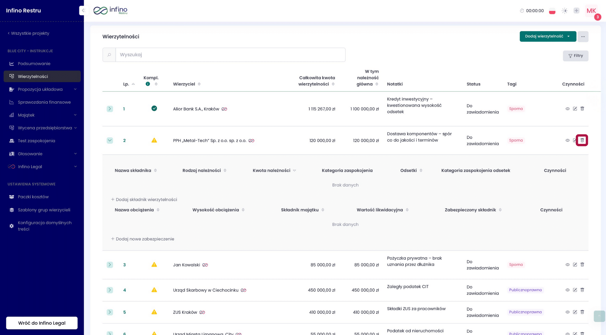 - W zakładce Wierzytelności znajdź wpis, który chcesz usunąć.