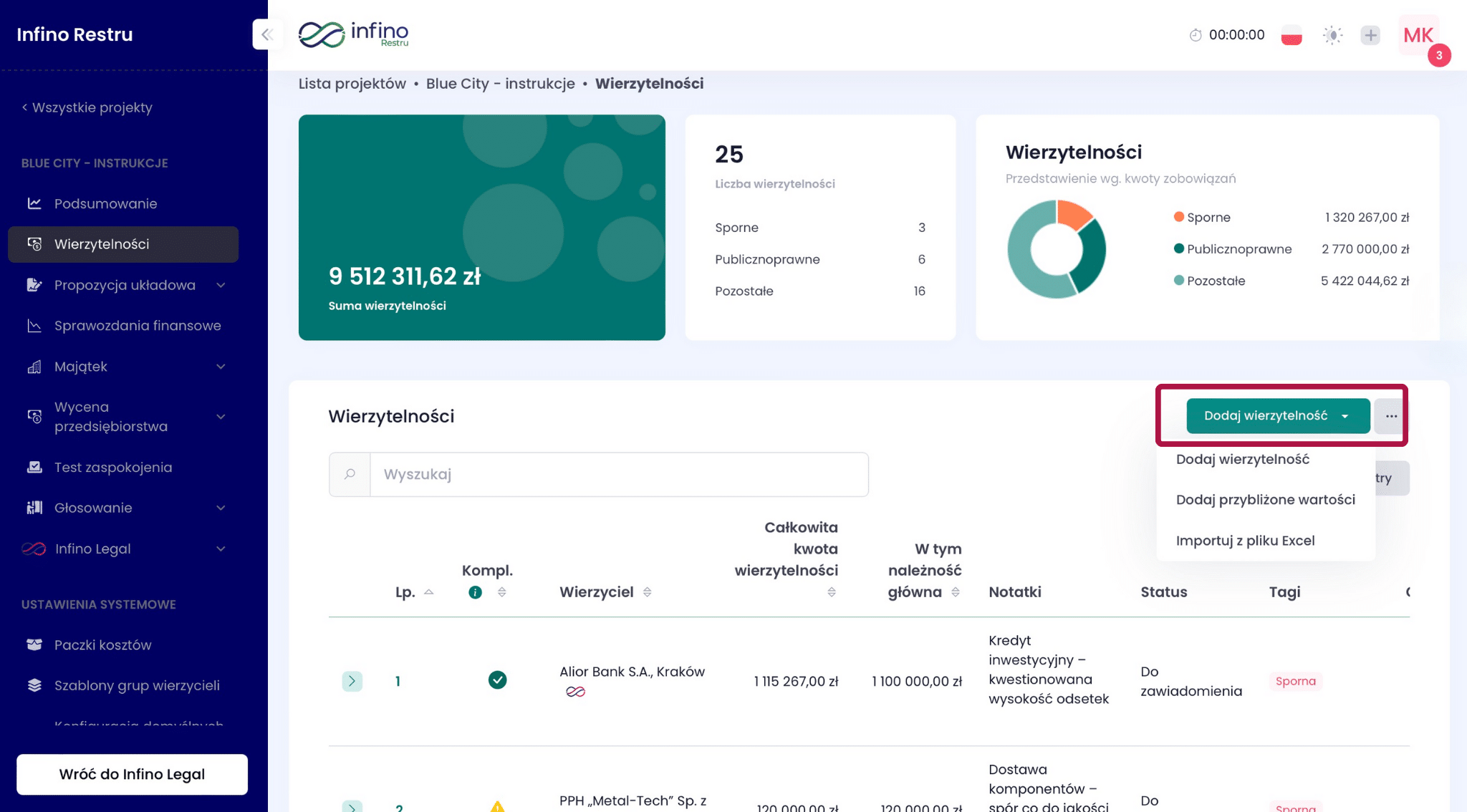 Dowiesz się, jak w Infino Restru zarządzać wierzytelnościami w projekcie – od ręcznego dodania nowej pozycji, przez edycję i import, aż po usuwanie błędnych danych.