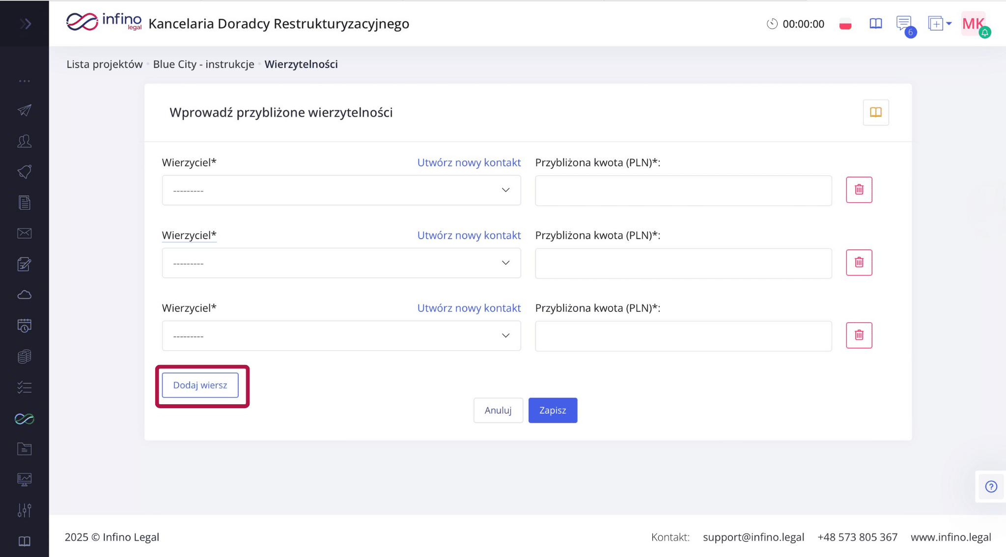 - Wpisz dane wierzyciela i kwotę – aby dodać kolejnych, kliknij Dodaj wiersz.