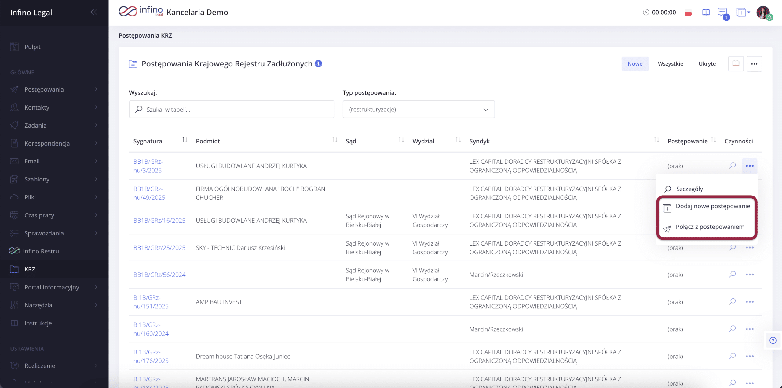 Czasem bywa tak, że nie uruchomiłeś projektu Restru od razu, a postępowanie zostało już ogłoszone i widoczne w Krajowym Rejestrze Zadłużonych (KRZ). Ta instrukcja pokazuje, jak po fakcie połączyć takie postępowanie z Infino Restru — przy zachowaniu poprawności i porządku danych.