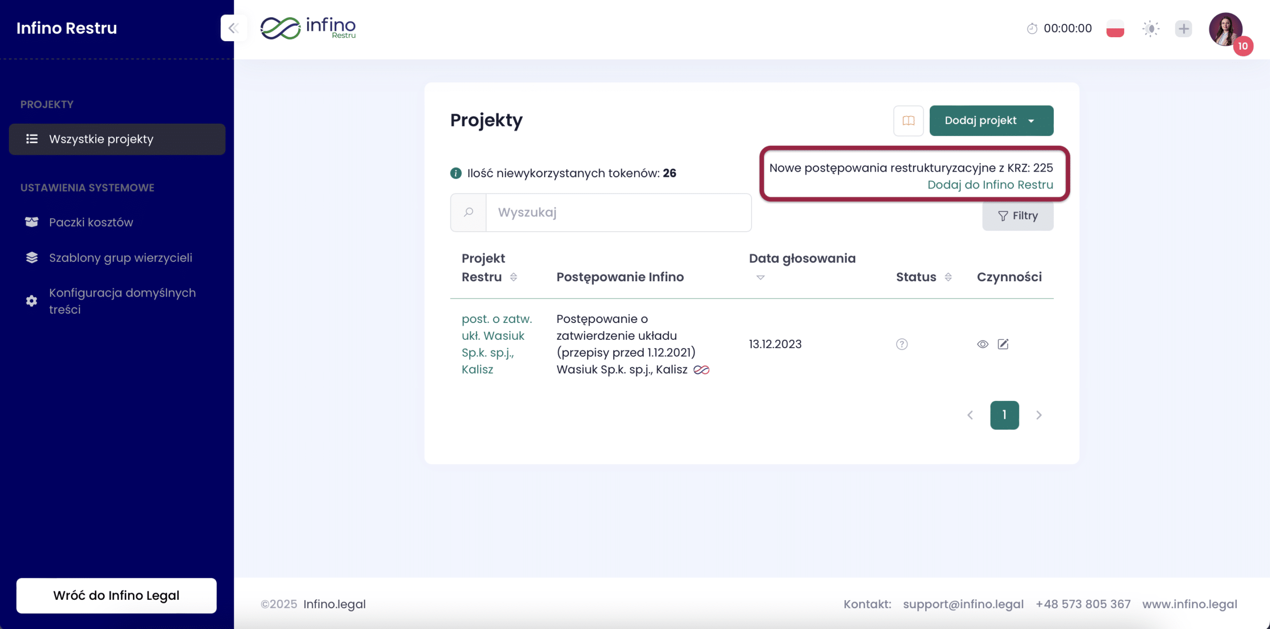 Restru daje pełną przewagę, gdy użyjesz go już na etapie oceny układu (Restru Starter) — dostęp do modułów majątek, import wierzytelności, analiza wskaźnikowa i generowanie dokumentów będzie prostsze i spójne. Więcej na ten temat znajdziesz tutaj -> Czym jest Restru Starter i czym różni się Restru Starter od Restrukturyzacji - Jeśli nie widzisz postępowania na liście, upewnij się, że w KRZ jest ono oznaczone jako restrukturyzacyjne. Import z KRZ pozwala na szybsze uzupełnienie danych w Infino Restru jeśli postępowanie już trwa, ale zawsze należy zweryfikować kompletność danych.