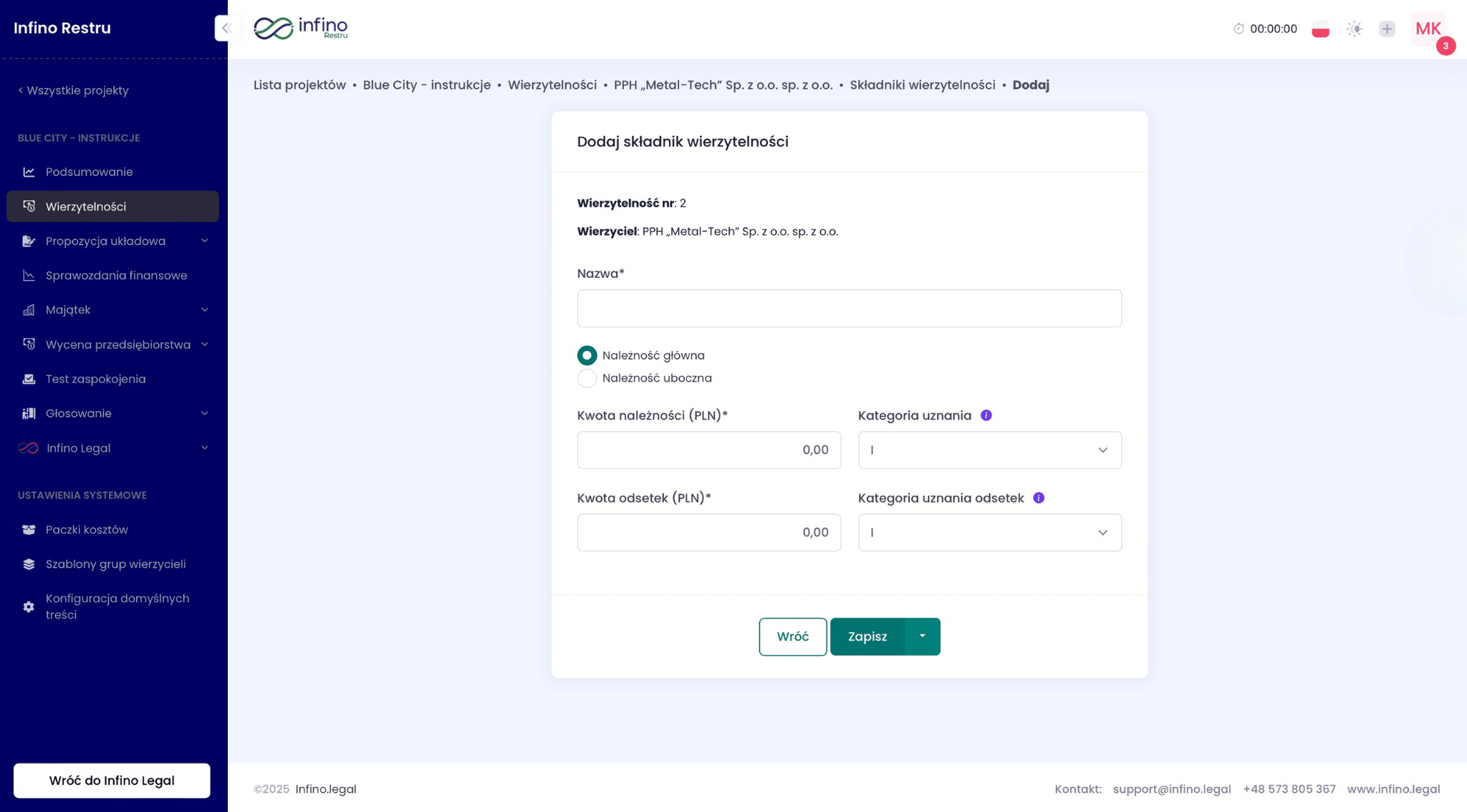 Dodając składniki i zabezpieczenia do wierzytelności, zyskujesz pełniejszy obraz sytuacji prawnej i majątkowej w danym postępowaniu. Dzięki temu dokumentacja jest przejrzysta, kompletna i gotowa do wykorzystania w raportach oraz spisie wierzytelności.