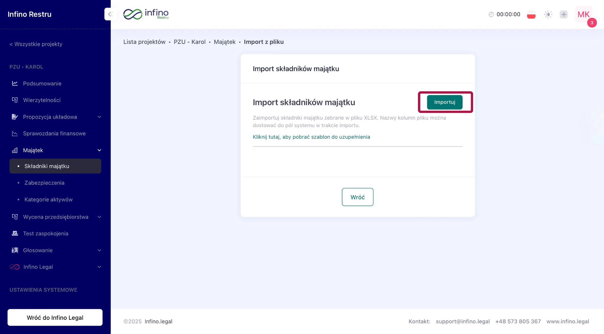 • System przeniesie Cię do ekranu z importerem składników majątku. Kliknij przycisk Importuj. Pojawi się okno do przesłania pliku, a następnie system przeprowadzi Cię krok po kroku przez cały import.