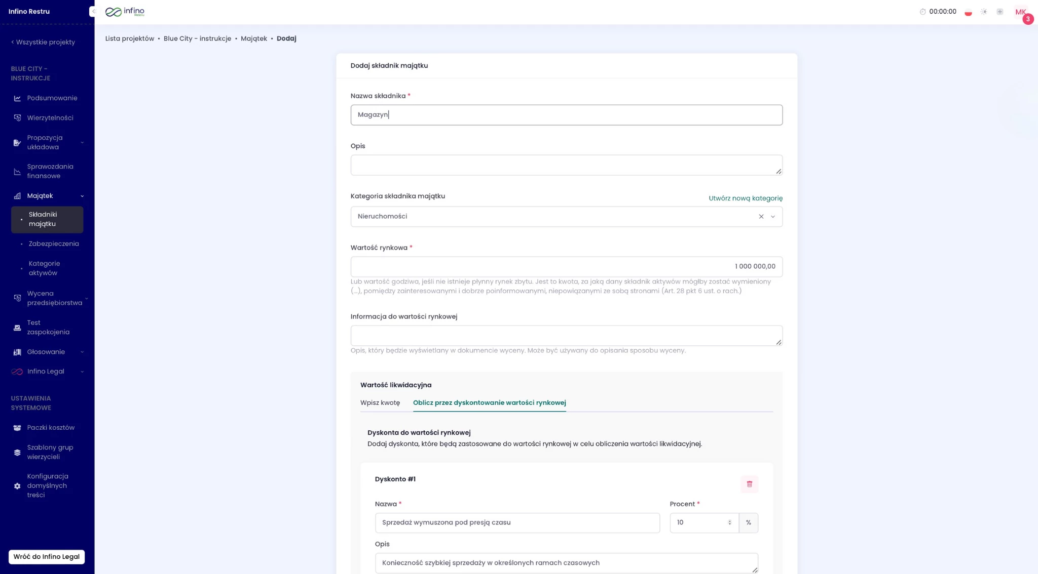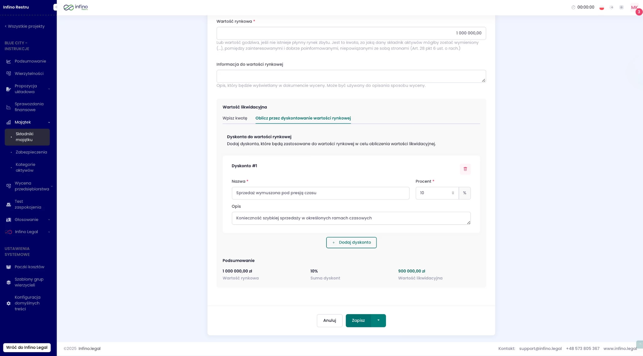 Do jednego składnika majątku możesz dodać więcej niż jedno dyskonto. Wartość każdego pomniejszenia wartości likwidacyjnej przez dyskonto należy wpisać za pomocą procenta (%). System automatycznie zsumuje wszystkie dyskonta i obliczy końcową wartość likwidacyjną: