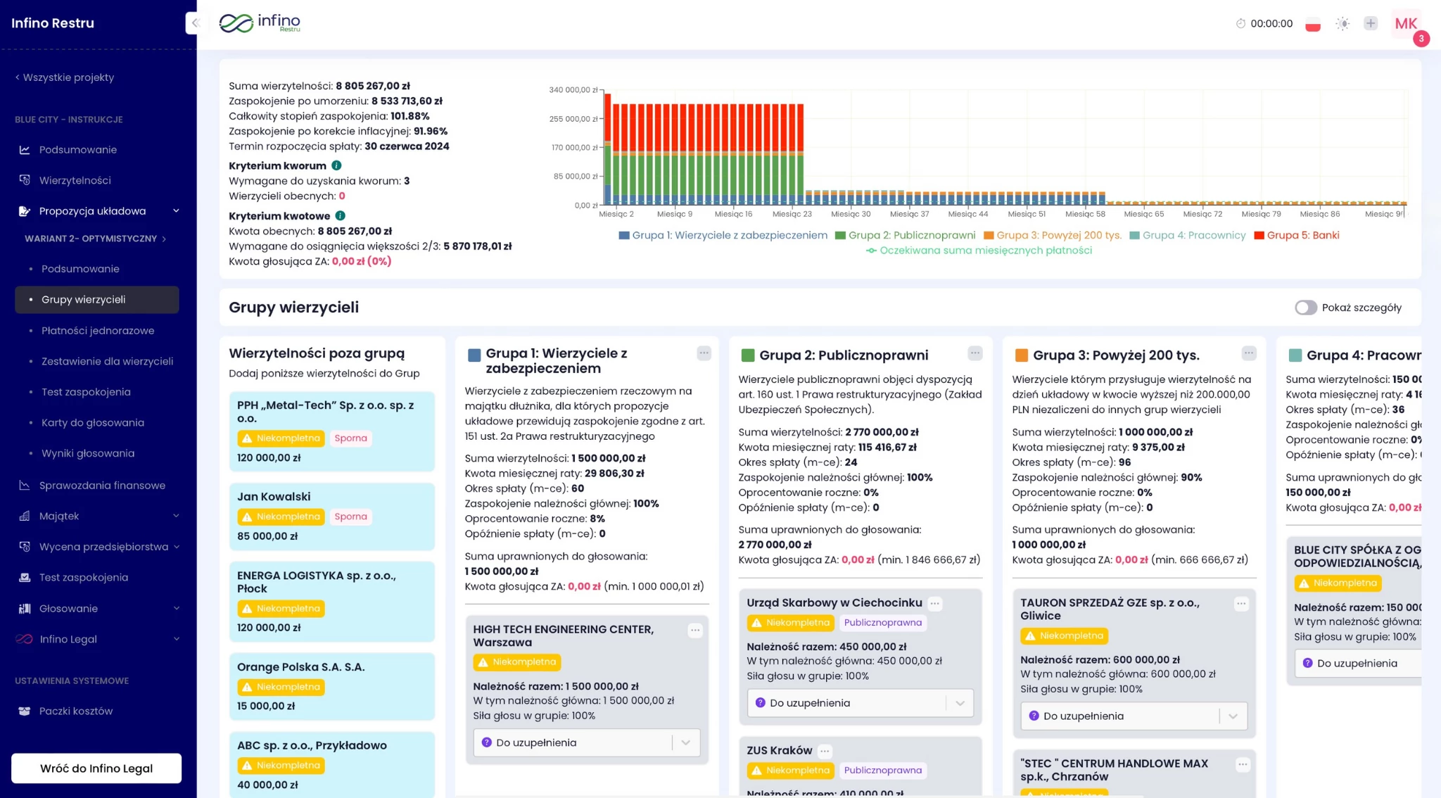 System automatycznie przelicza sumy wierzytelności, wartości procentowe oraz warunki spłat w każdej grupie, dzięki czemu od razu widzisz aktualny stan propozycji.
