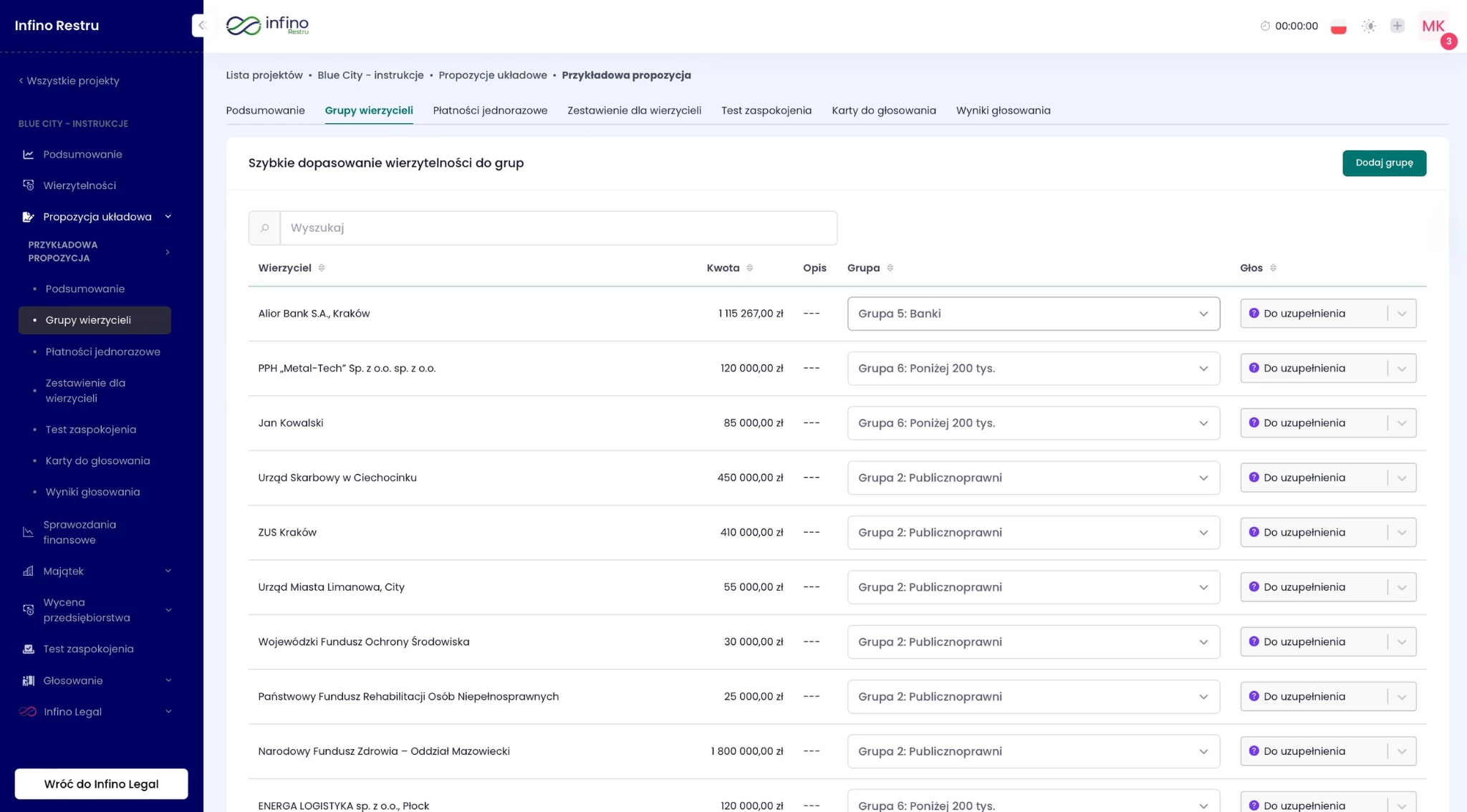 Po lewej stronie ekranu zobaczysz listę wszystkich wierzycieli w projekcie, a po prawej utworzone grupy wierzycieli według Twojego podziału.