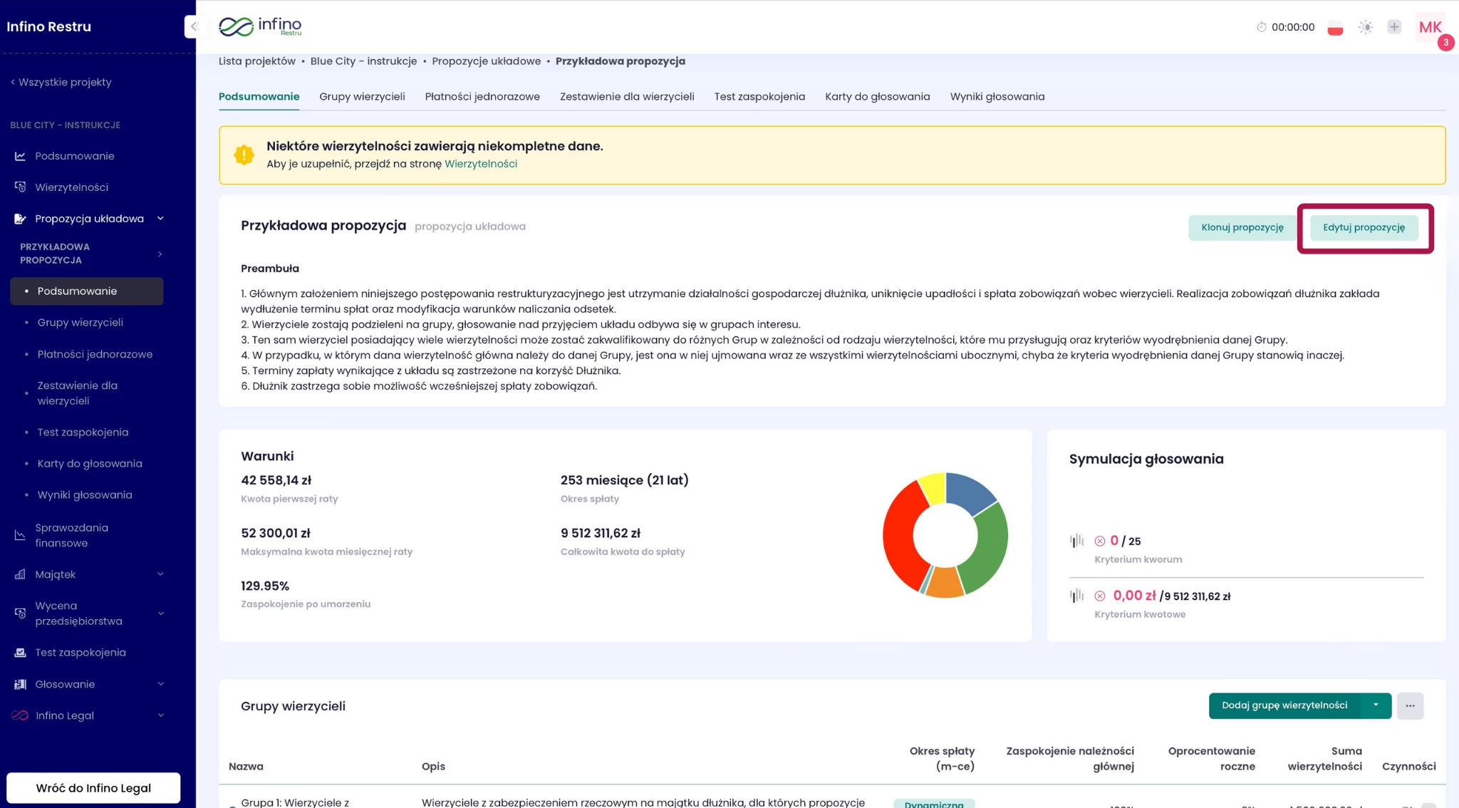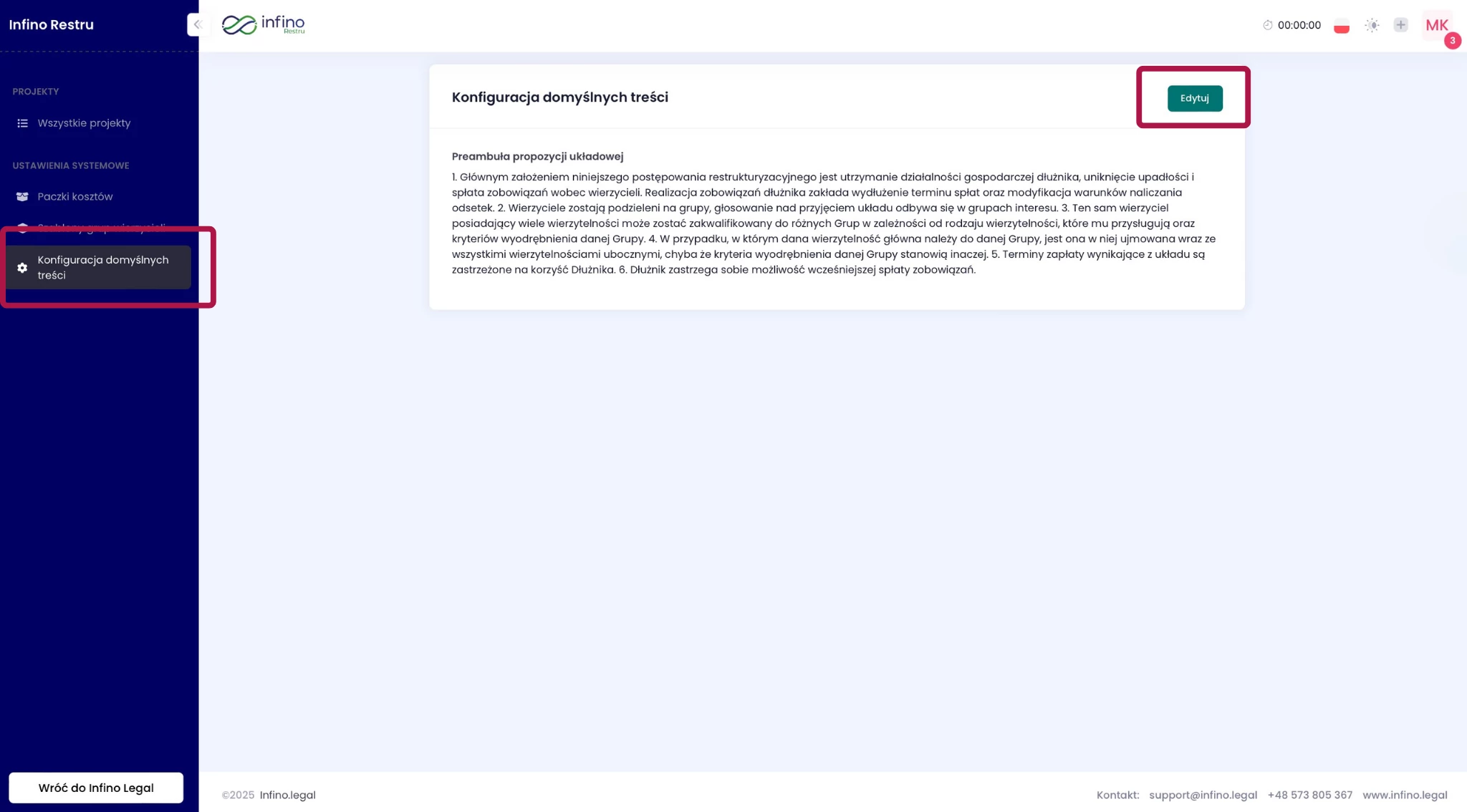 Dowiesz się, jak edytować preambułę propozycji układowej w module Infino Restru – czyli część opisową, w której przedstawiasz kontekst układu, motywy jego zawarcia oraz najważniejsze założenia planu restrukturyzacyjnego.