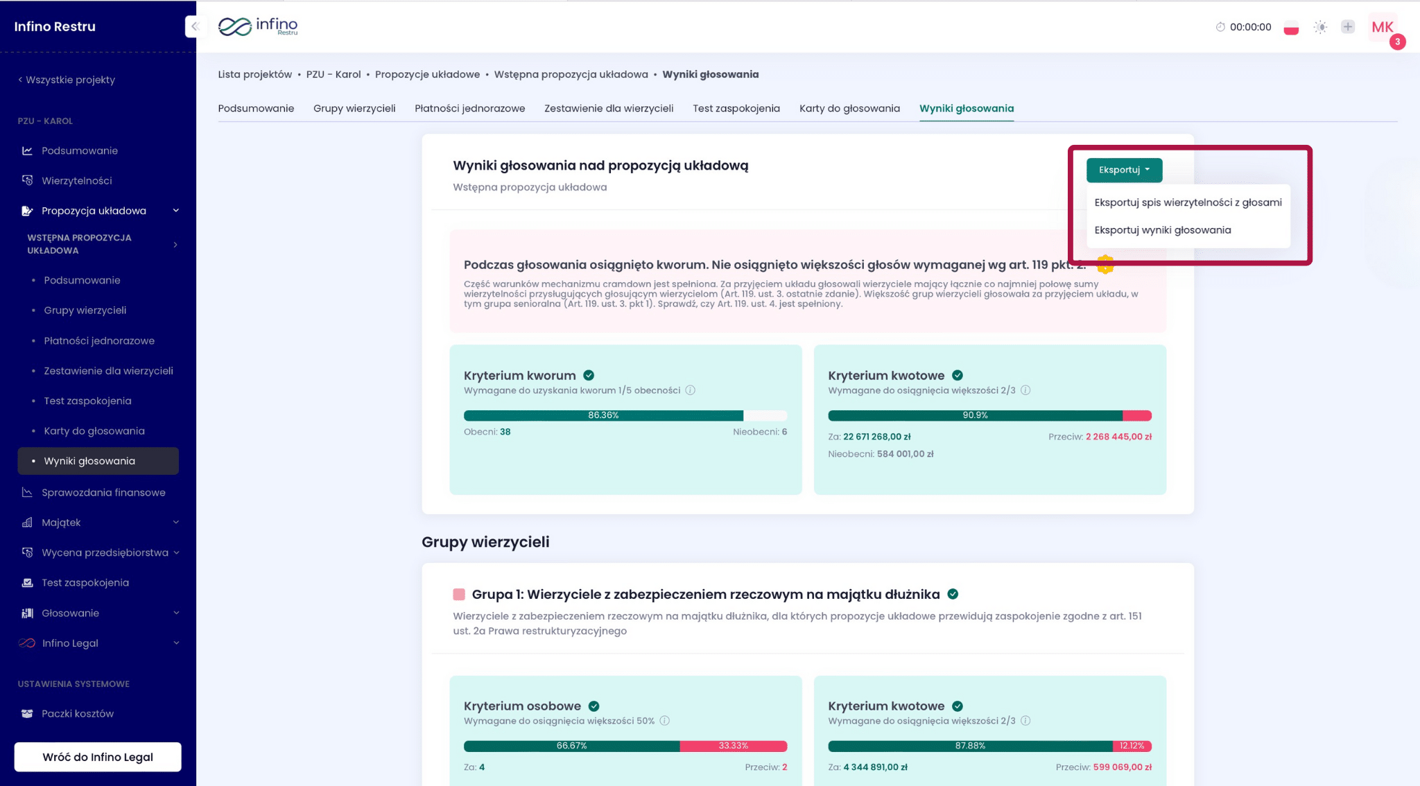 • Możesz w każdej chwili wyeksportować Spis wierzytelności z głosami lub Wyniki głosowania, klikając przycisk Eksportuj.