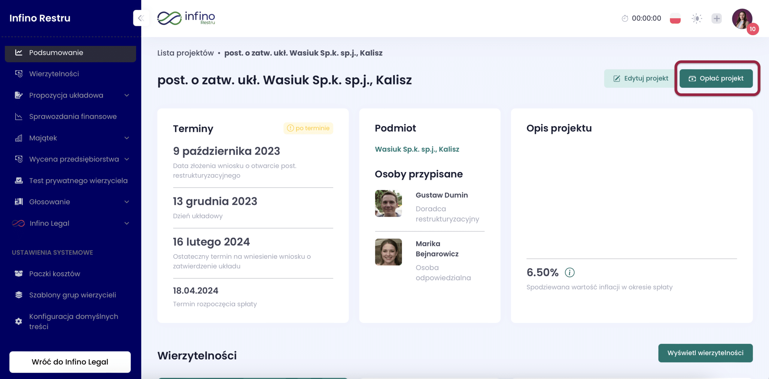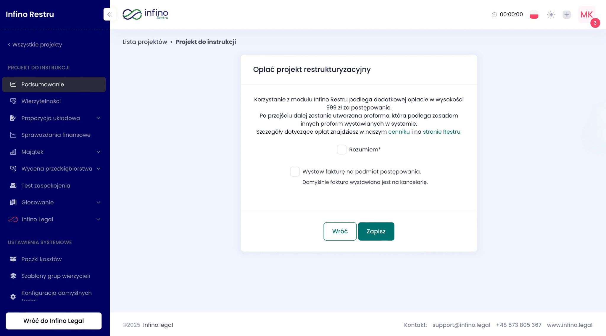 Opłacenie projektu w Restru to szybki i prosty proces. Wystarczy kliknąć przycisk Opłać projekt w podsumowaniu projektu, zaznaczyć odpowiednie okienka i zapisać. System wygeneruje proformę, którą otrzymasz zarówno mailowo, jak i widoczna będzie ona w zakładce Rozliczenia w Infino Legal. Dzięki temu możesz w pełni korzystać z funkcjonalności Restru i prowadzić postępowania restrukturyzacyjne z użyciem wszystkich narzędzi systemu.