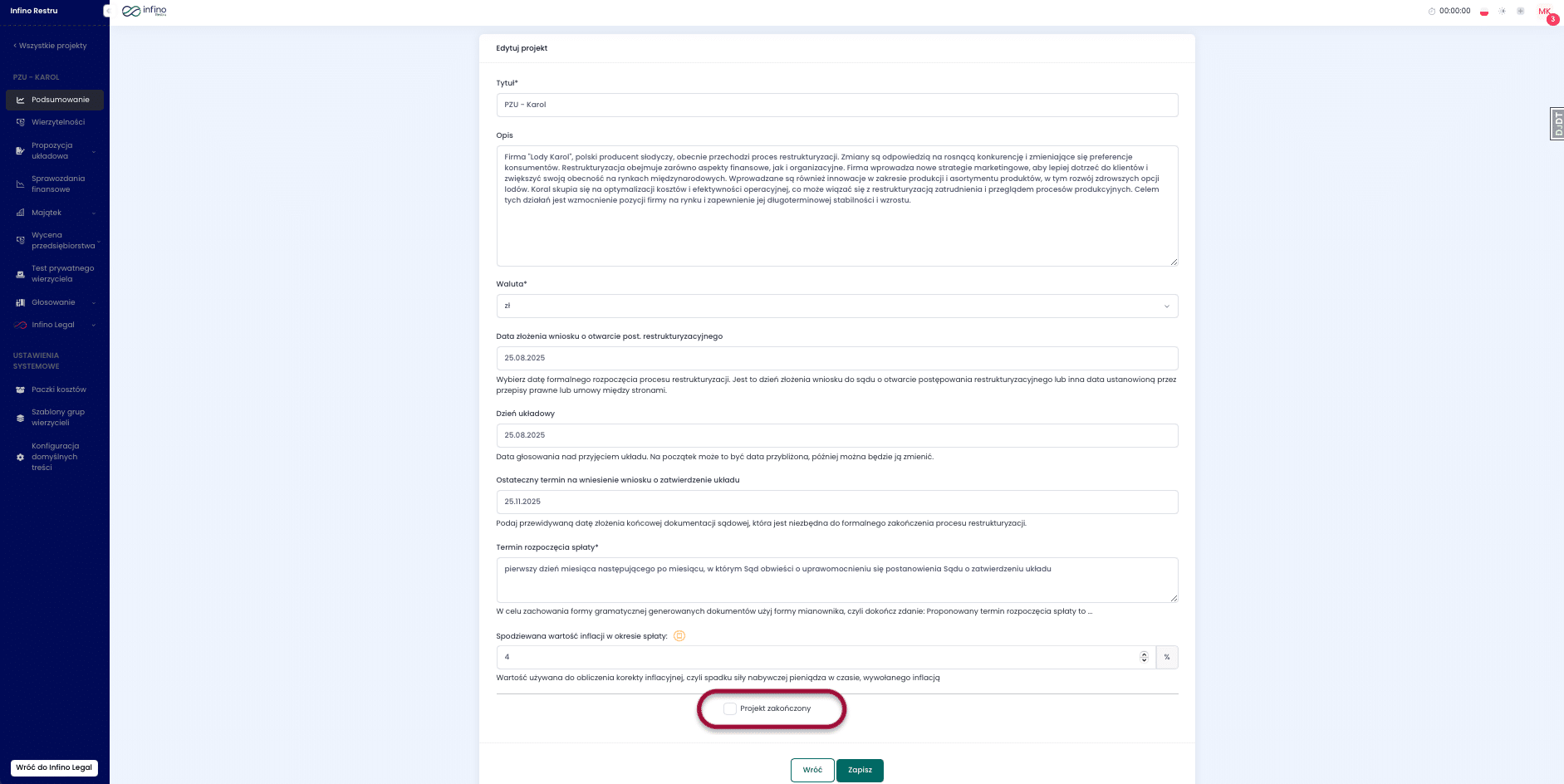 Zamknięcie projektu w Restru to prosty sposób na uporządkowanie pracy i oddzielenie spraw zakończonych od aktywnych. Wystarczy zaznaczyć okienko Projekt zakończony w edycji projektu. Wszystkie zamknięte sprawy znajdziesz później w filtrze Zakończone na liście projektów. Dzięki temu zawsze masz dostęp do pełnej historii restrukturyzacji.