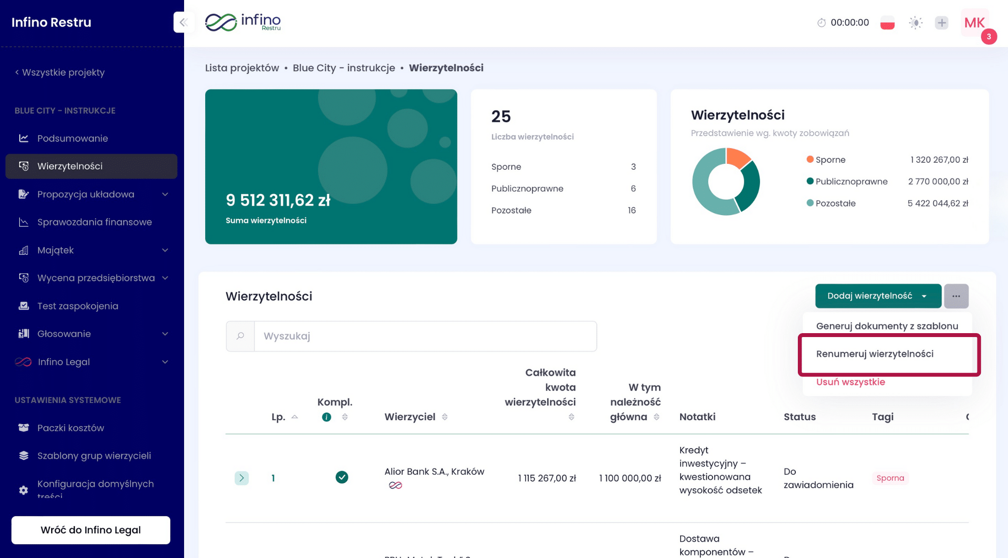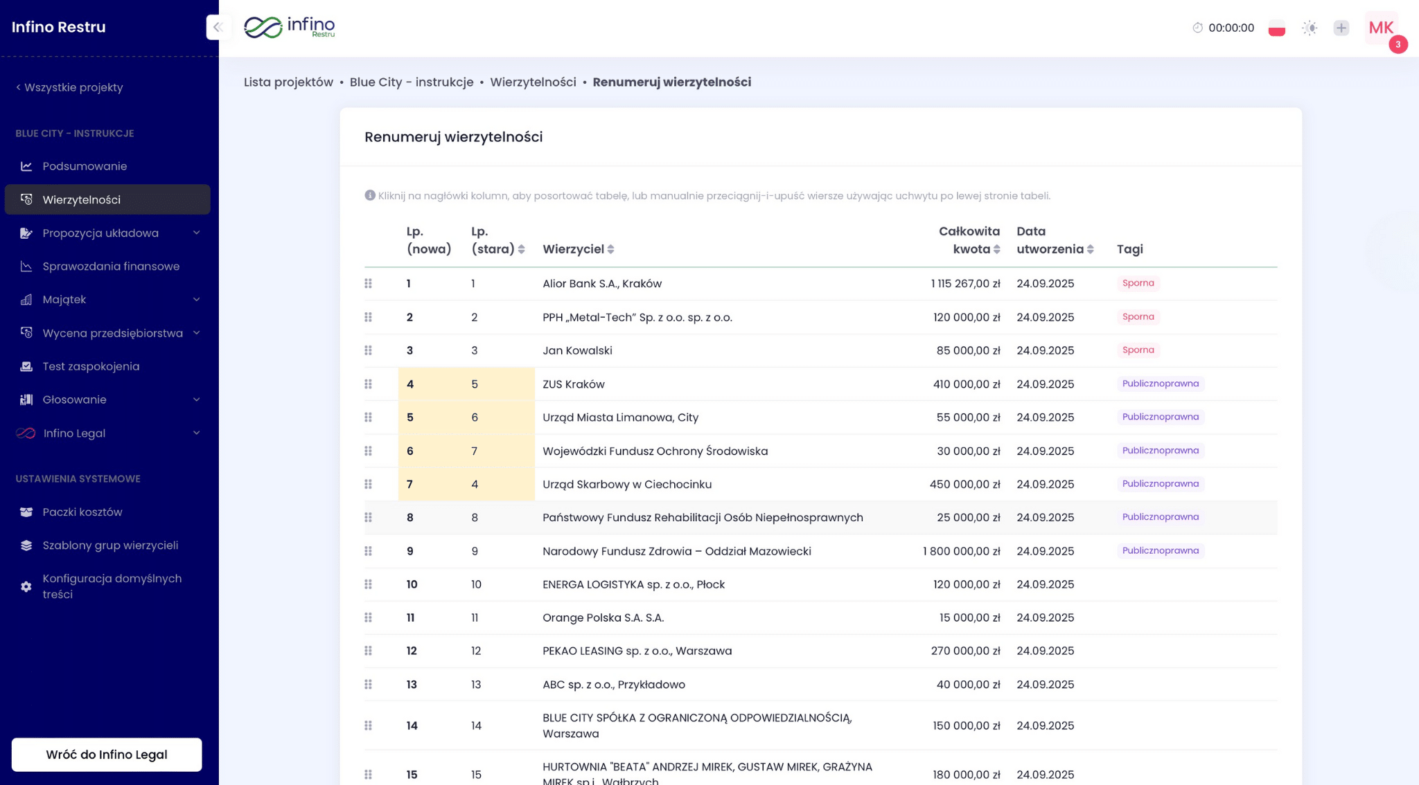 Instrukcja wyjaśnia, jak możesz zmienić numerację wierzytelności w projekcie. To przydatne, gdy chcesz uporządkować listę lub dostosować kolejność wierzycieli zgodnie z dokumentacją sprawy.