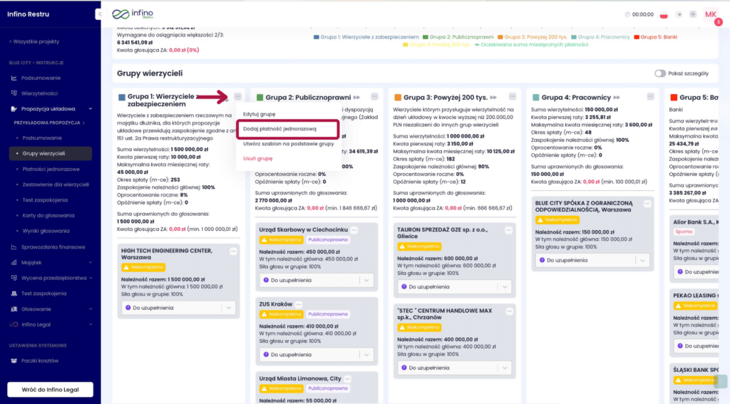 Dowiesz się, czym są płatności jednorazowe w module Infino Restru, w jakich sytuacjach warto je stosować oraz jak dodać je do propozycji układowej – zarówno z poziomu zakładki Płatności jednorazowe, jak i bezpośrednio z widoku grup wierzycieli.