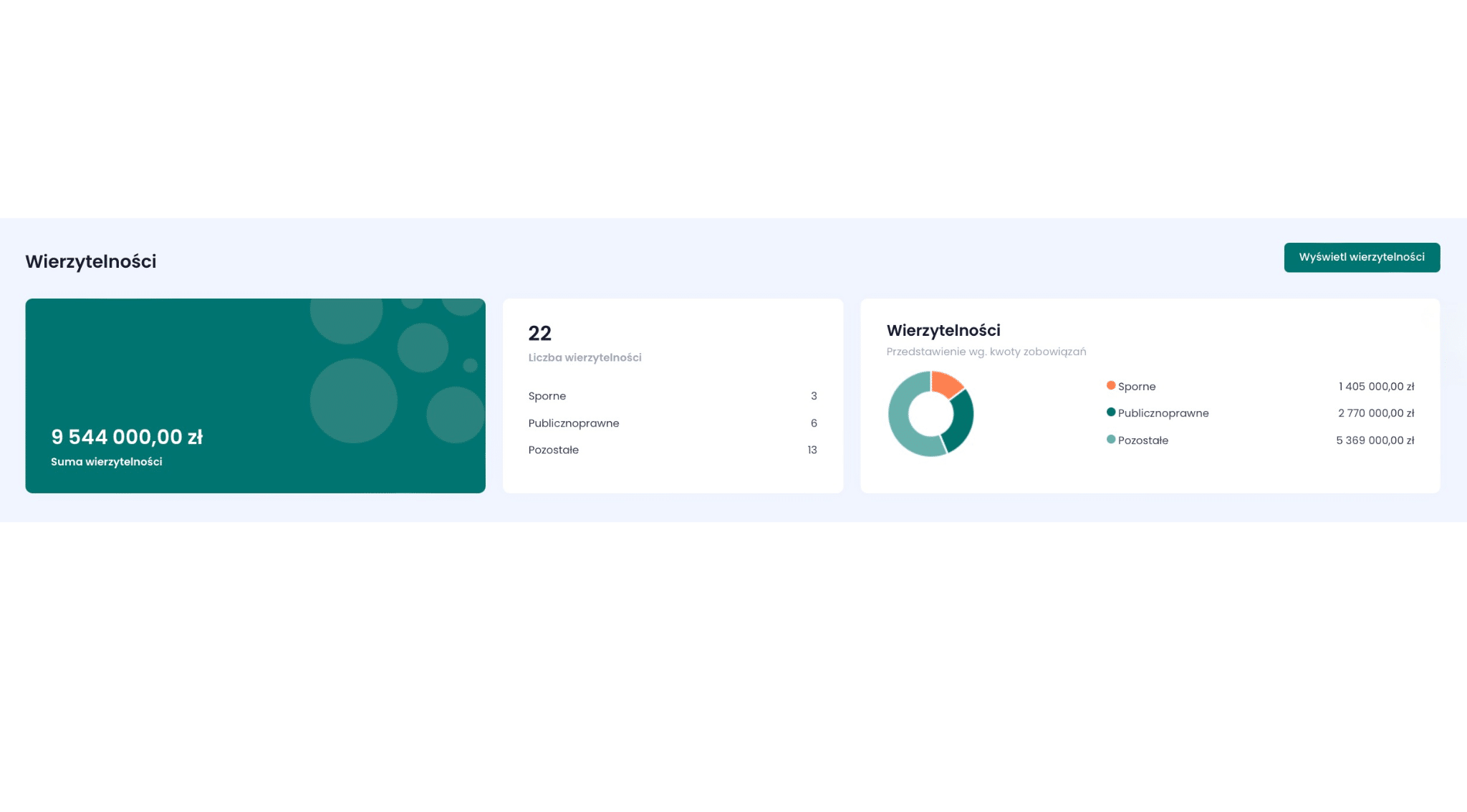 • Wierzytelności- w tej części łatwo podejrzysz sumę wierzytelności wprowadzonych do systemu, ich liczbę oraz rodzaj (sporne, publicznoprawne, pozostałe) wraz z przestawieniem ich na wykresie. Klikając w przycisk „Wyświetl wierzytelności” przejdziesz do sekcji, w której możesz dodać lub edytować wierzytelność.