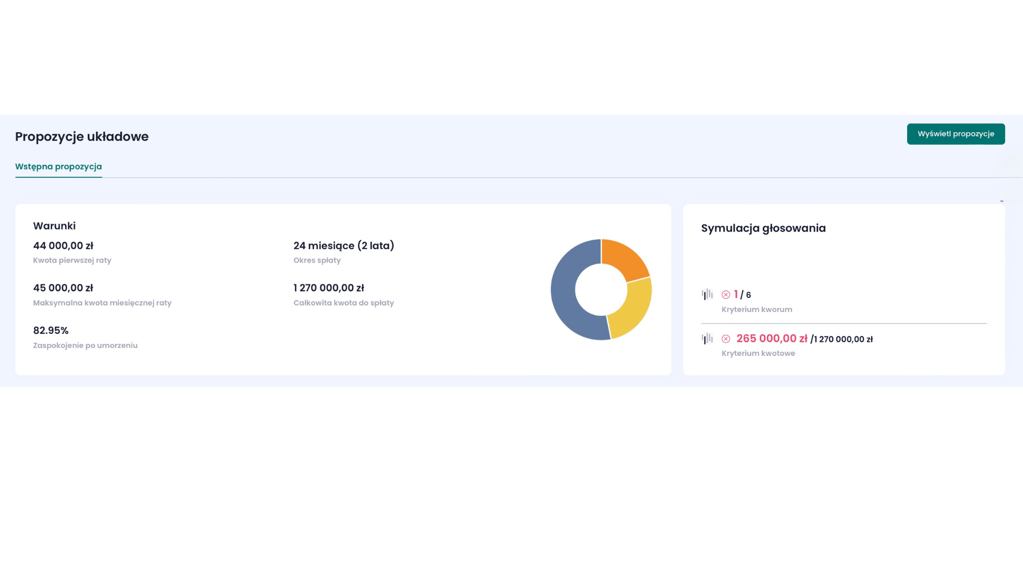 • Propozycje układowe- w tej części wyświetlać się będą najważniejsze informacje ze stworzonych przez Ciebie propozycji układowych – Warunki układu oraz Symulacja głosowania. Jeśli któraś z informacji niezbędnych do stworzenia propozycji układowej będzie niekompletna – system wyświetli Ci taki komunikat. Podobnie jak we wcześniejszej sekcji „Wierzytelności” również tutaj możesz szybko przejść do edycji konkretnej propozycji klikając w przycisk „Wyświetl propozycję”.