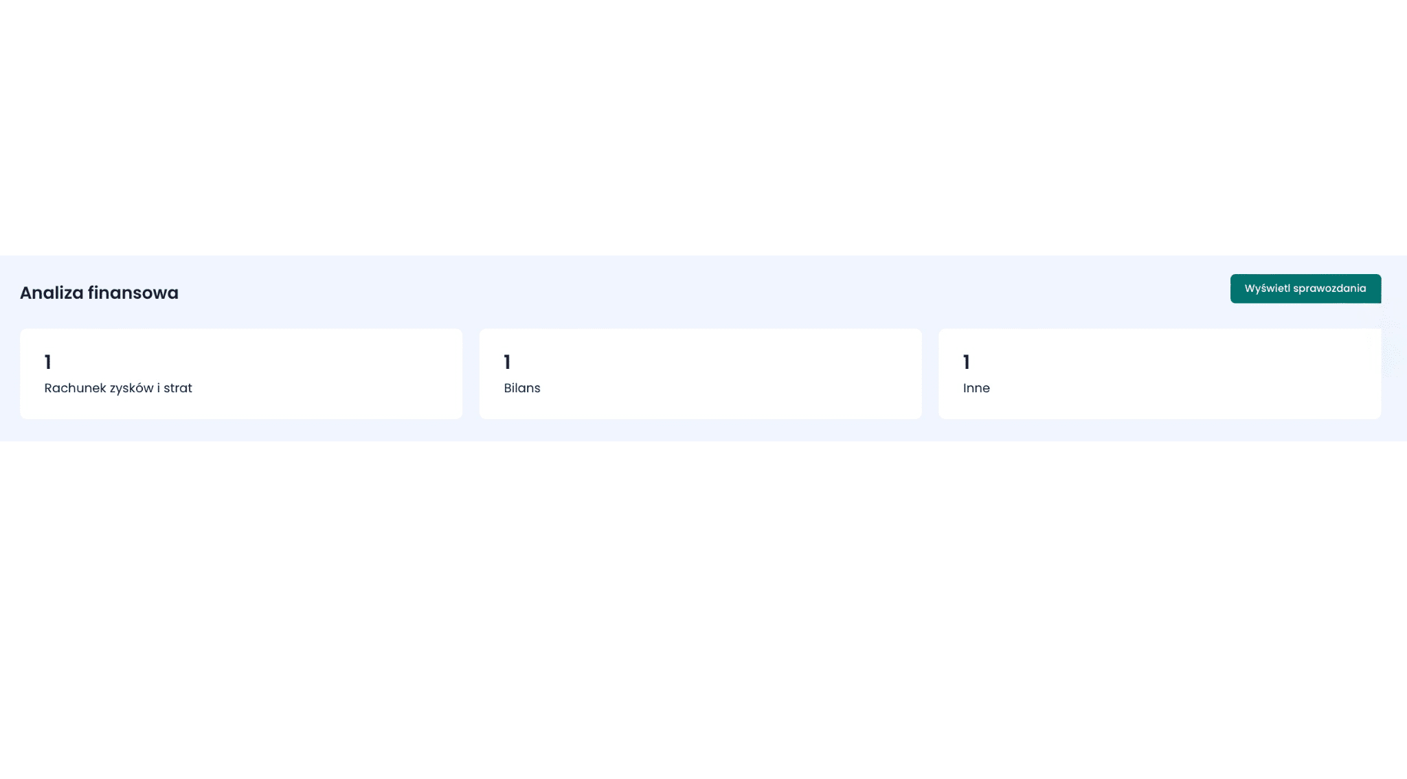 • Analiza finansowa– znajdziesz tutaj informację o liczbie wprowadzonych dokumentów finansowych w tym: rachunków zysków i strat, bilansów oraz innych. Możesz do nich łatwo przejść klikając w przycisk „Wyświetl sprawozdania”