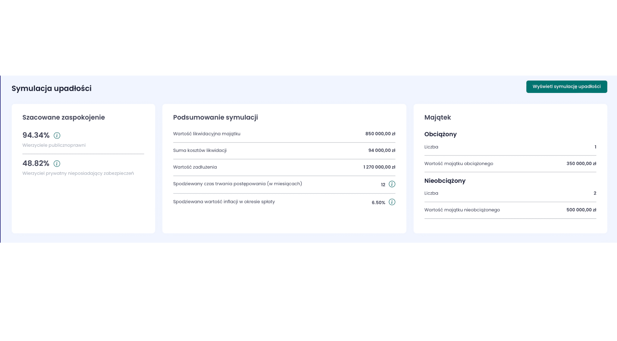 • Podsumowanie symulacji, czyli wartości likwidacyjnej majątku, sumie kosztów likwidacji, wartości zadłużenia, spodziewanym czasie trwania postępowania (w miesiącach) oraz o spodziewanej wartości inflacji w okresie spłaty