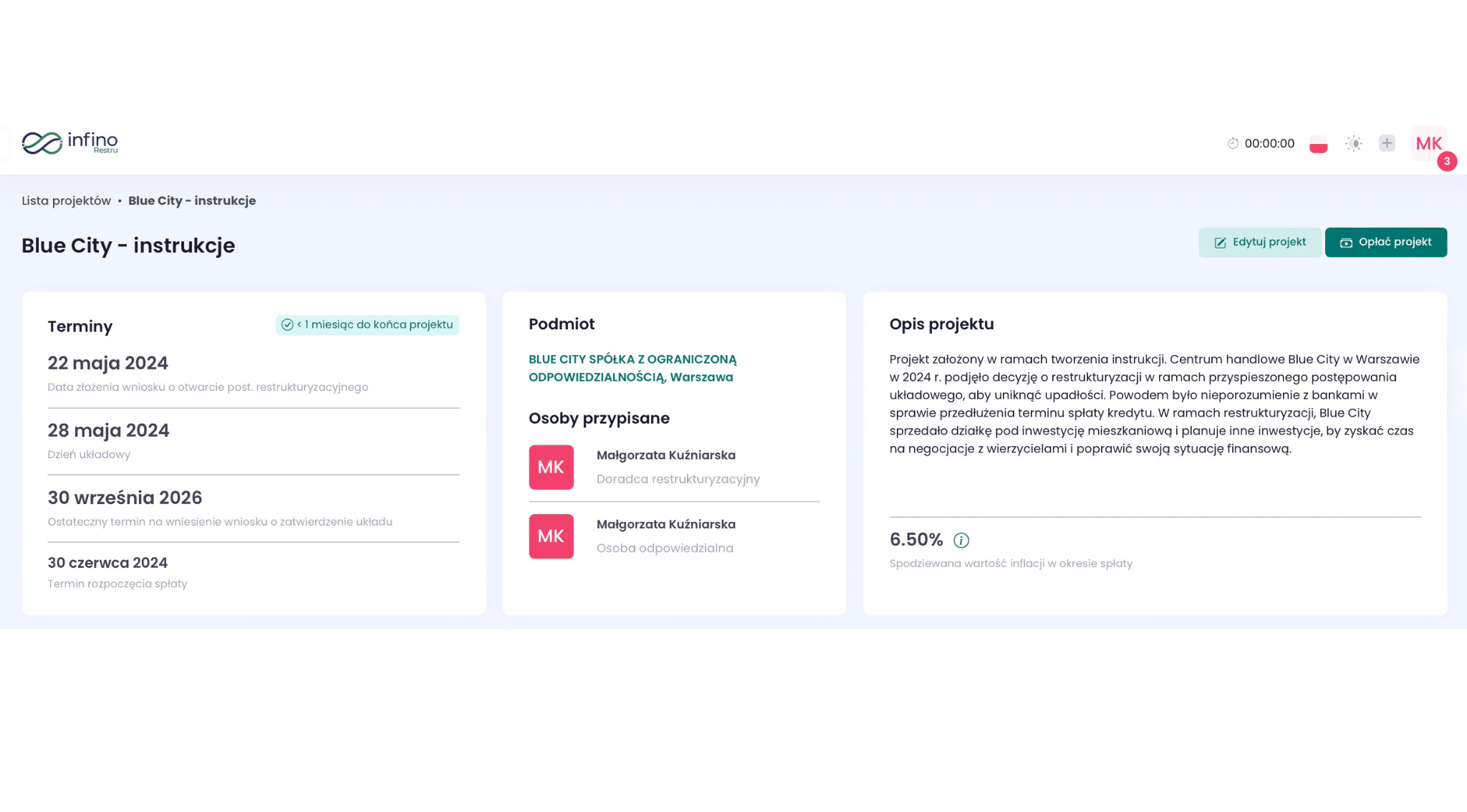 3. Sprawdź podstawowe dane – terminy, podmiot, osoby przypisane oraz opis projektu.