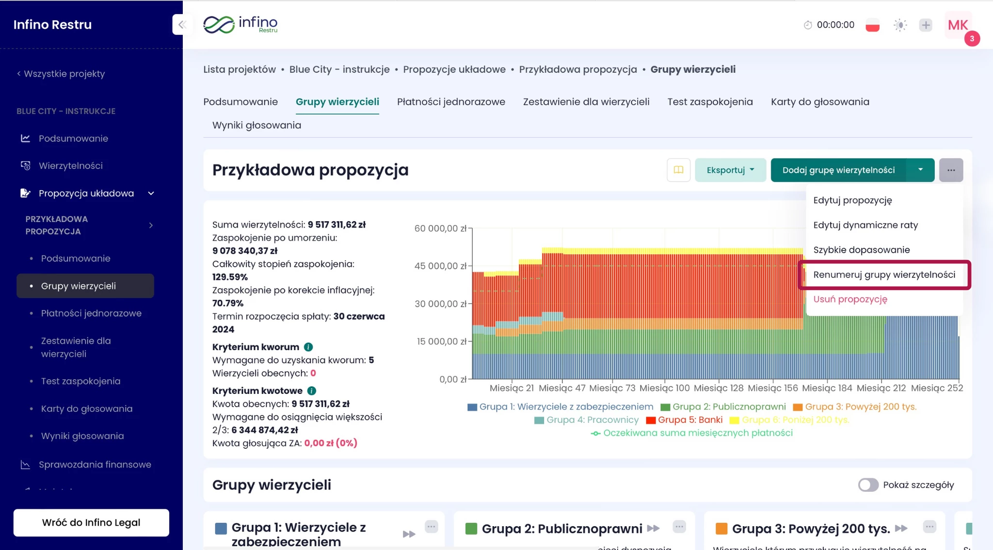 System automatycznie przelicza sumy wierzytelności, wartości procentowe oraz warunki spłat w każdej grupie, dzięki czemu od razu widzisz aktualny stan propozycji.