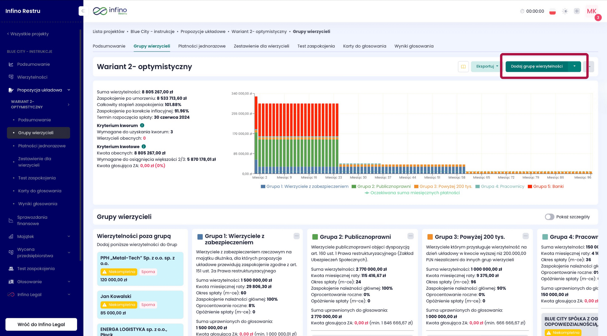 Po lewej stronie ekranu zobaczysz listę wszystkich wierzycieli w projekcie, a po prawej utworzone grupy wierzycieli według Twojego podziału .