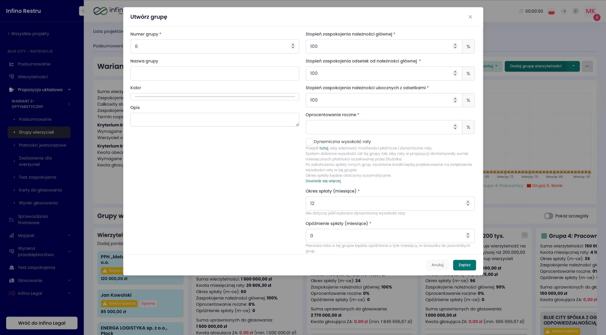 Przykład: możesz stworzyć grupę „Wierzyciele do 50 tys. zł” z umorzeniem odsetek i 6-miesięcznym okresem spłaty.