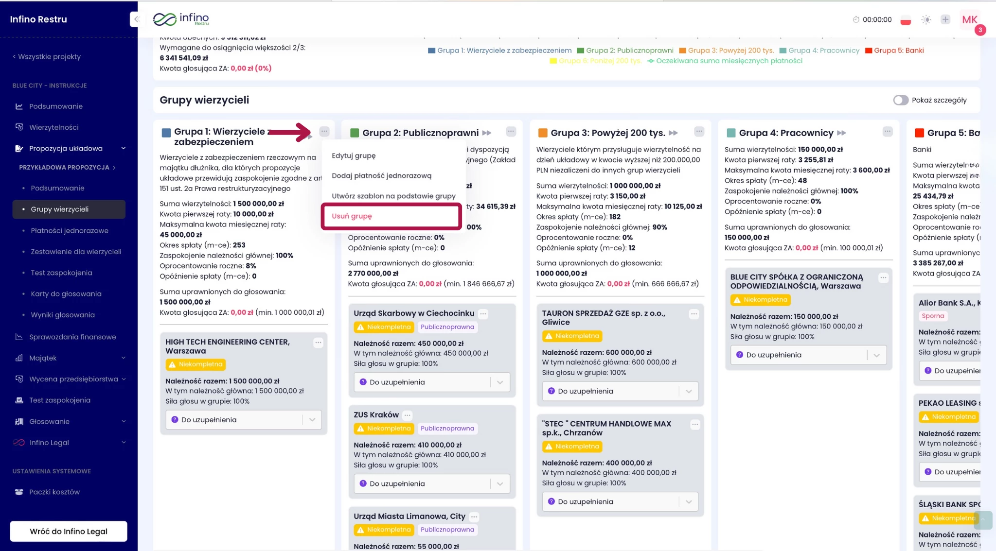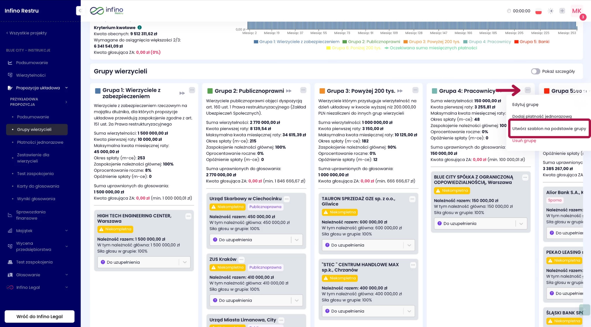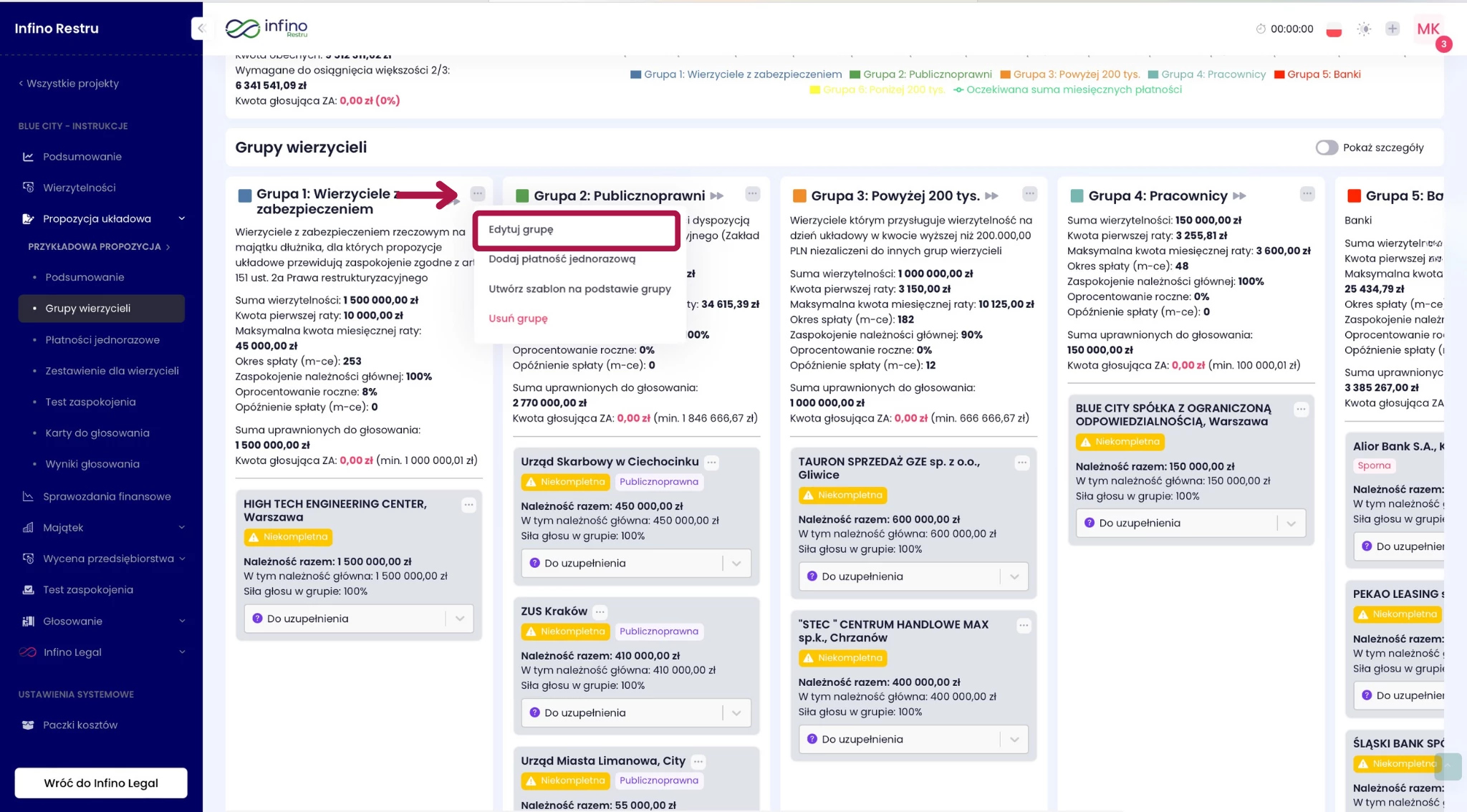 - Przejdź do Propozycje układowe → Grupy wierzycieli.