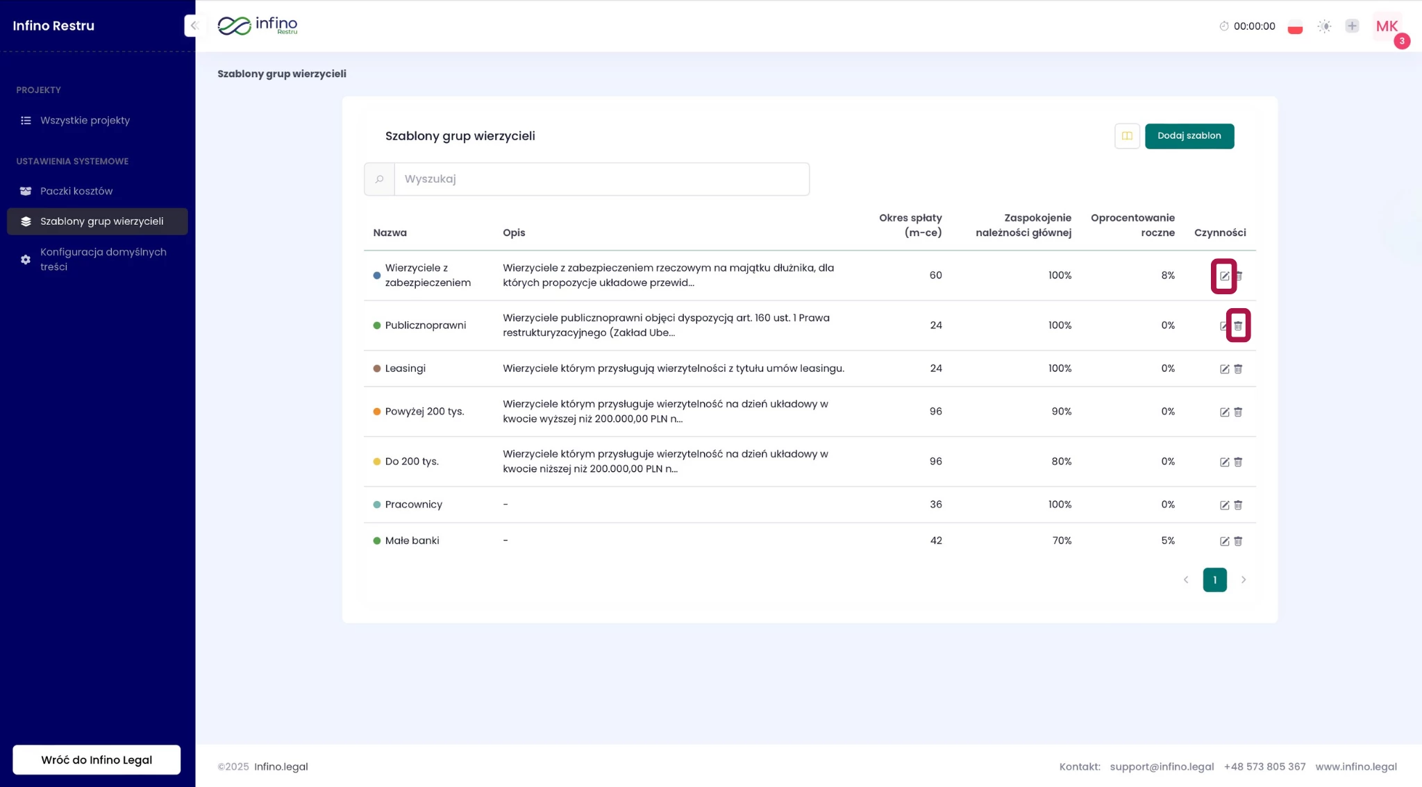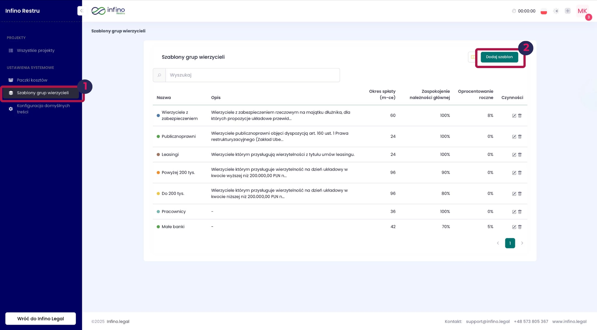 - Przejdź do zakładki Szablony grup wierzycieli w części Ustawienia systemowe.