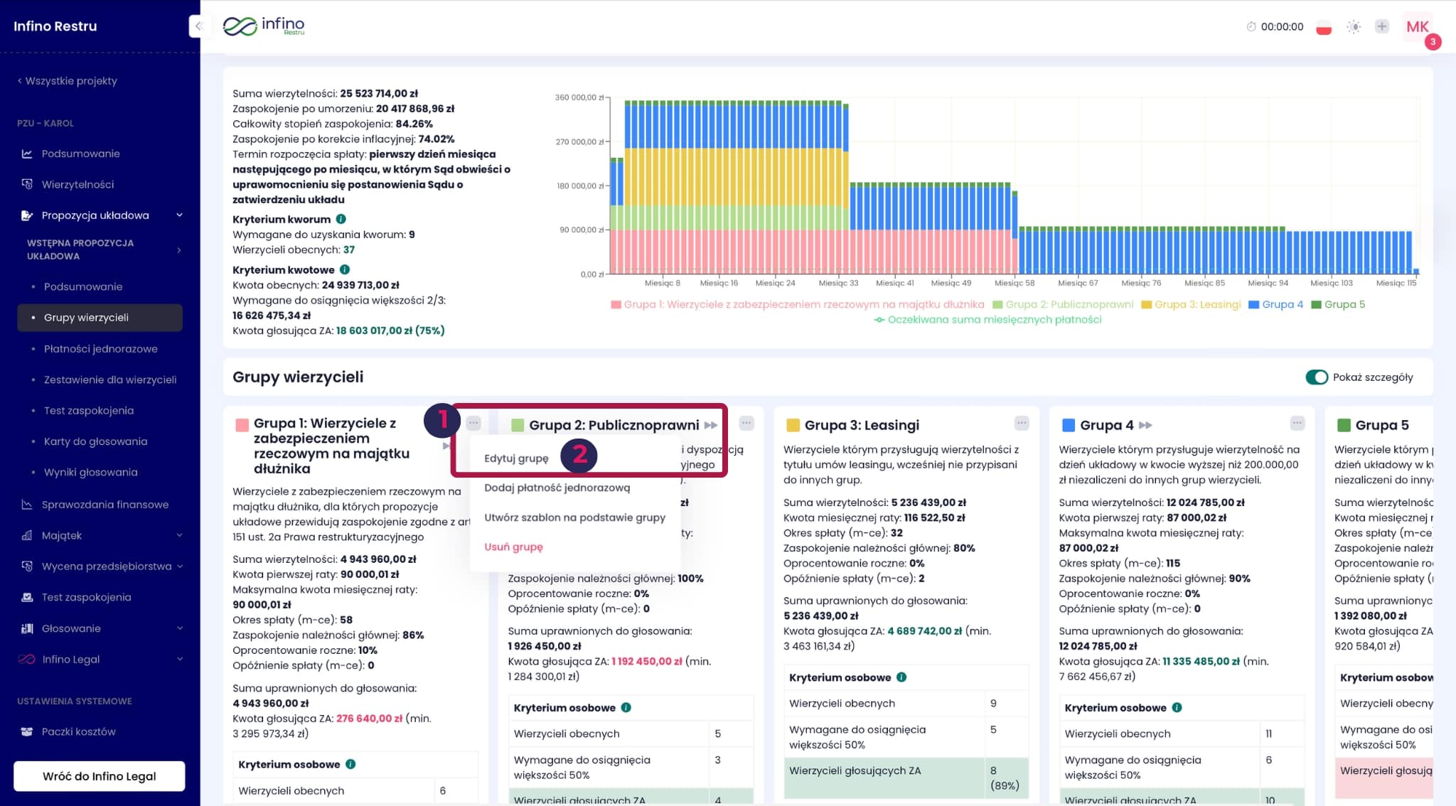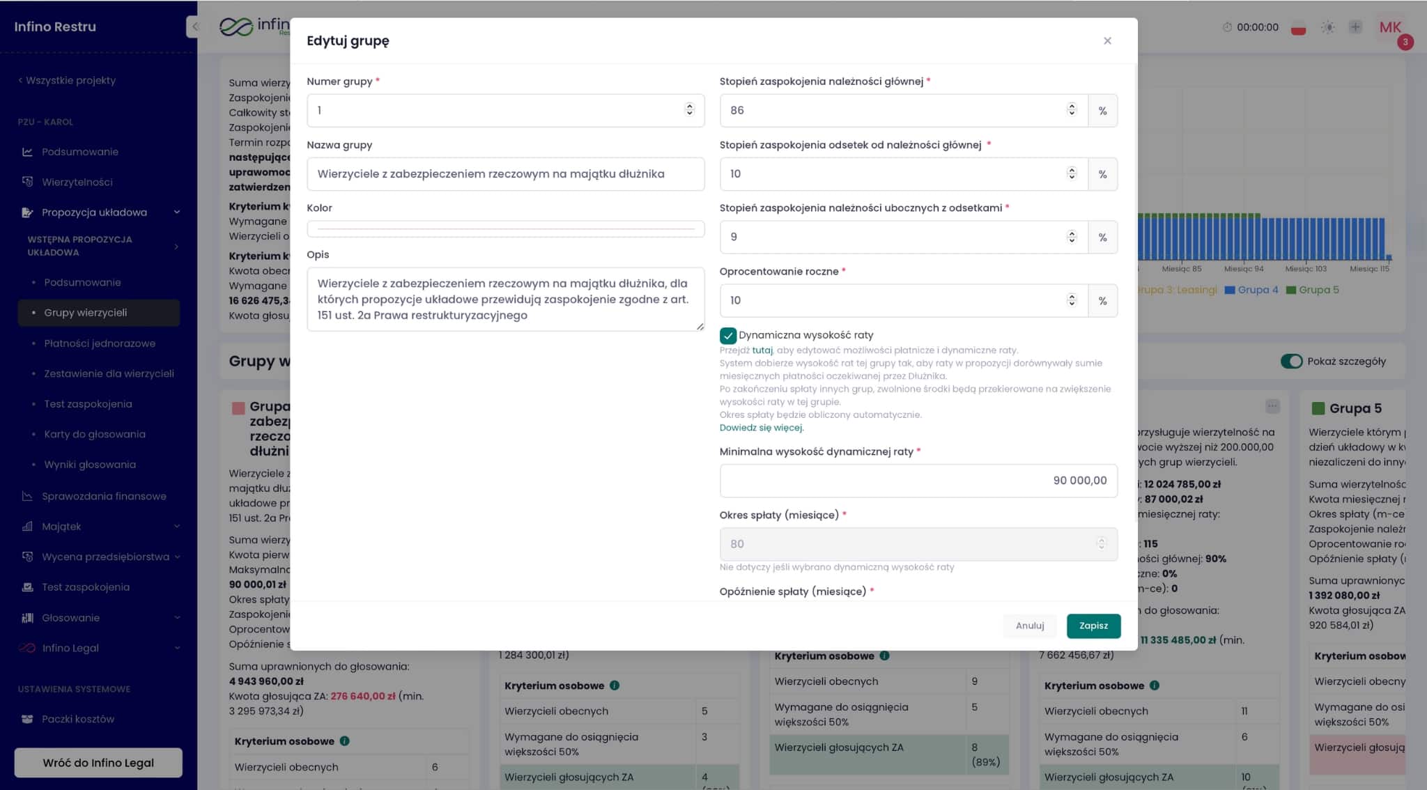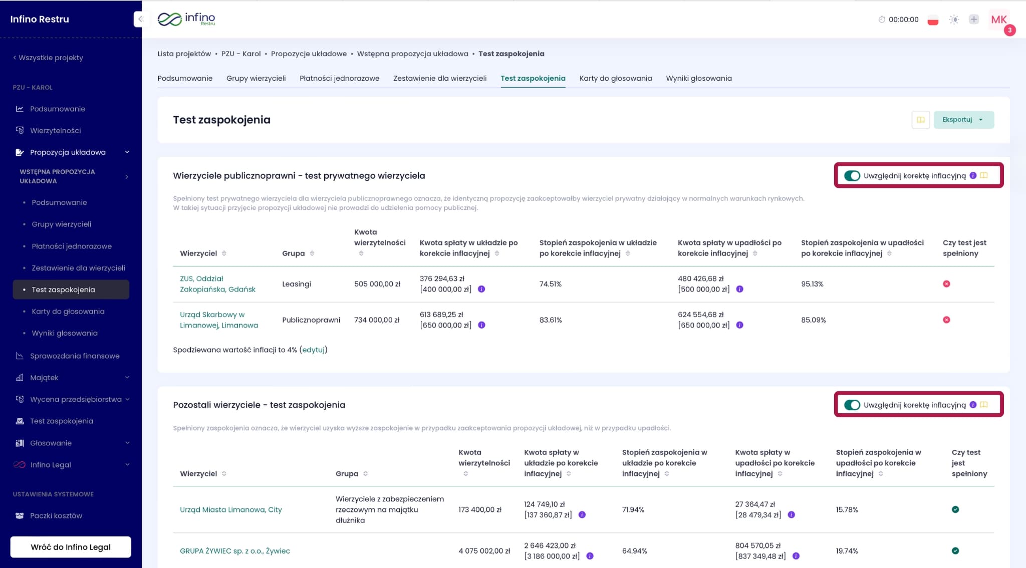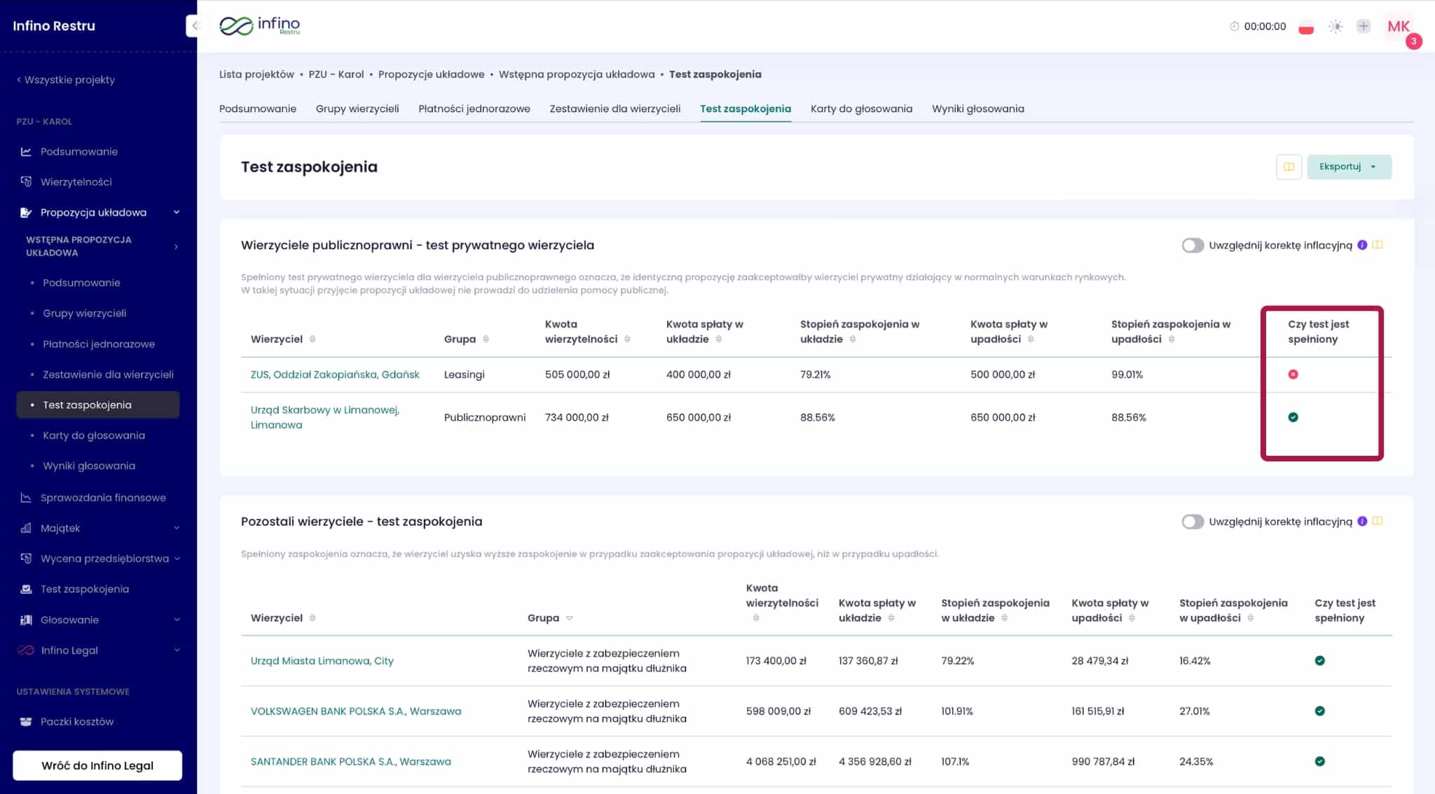 Test zaspokojenia w Infino Restru to narzędzie, które automatycznie ocenia, czy wierzyciel otrzyma w układzie co najmniej tyle samo, co w upadłości. Dzięki przejrzystym oznaczeniom szybko widzisz, którzy wierzyciele wymagają korekt w propozycji układowej. Masz do dyspozycji elastyczne narzędzia do dostosowania warunków spłat, weryfikacji symulacji upadłości oraz uwzględnienia inflacji. Korzystając z tej funkcji, zwiększasz szanse na powodzenie układu i akceptację wierzycieli.