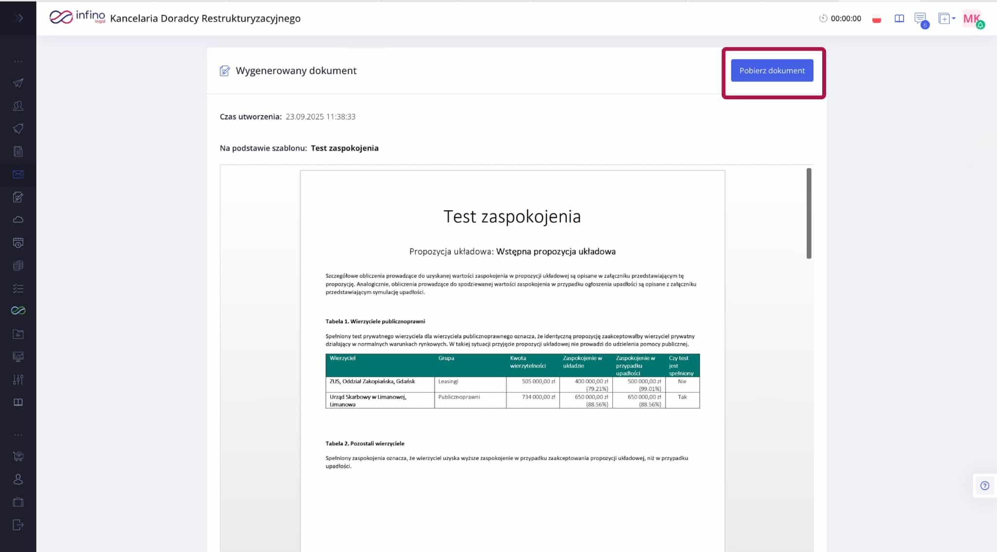 Instrukcja wyjaśnia, jak działa Test zaspokojenia w systemie Infino Restru, który automatycznie porównuje wysokość zaspokojenia wierzyciela w propozycji układowej z tym, co wierzyciel otrzymałby w przypadku upadłości. Dowiesz się, jak interpretować wyniki testu, jakie działania podjąć, gdy test nie jest spełniony oraz jak korygować warunki układu, symulację upadłości i inflację.