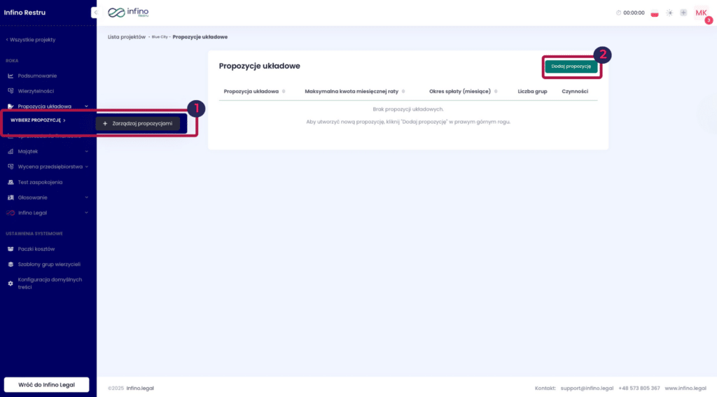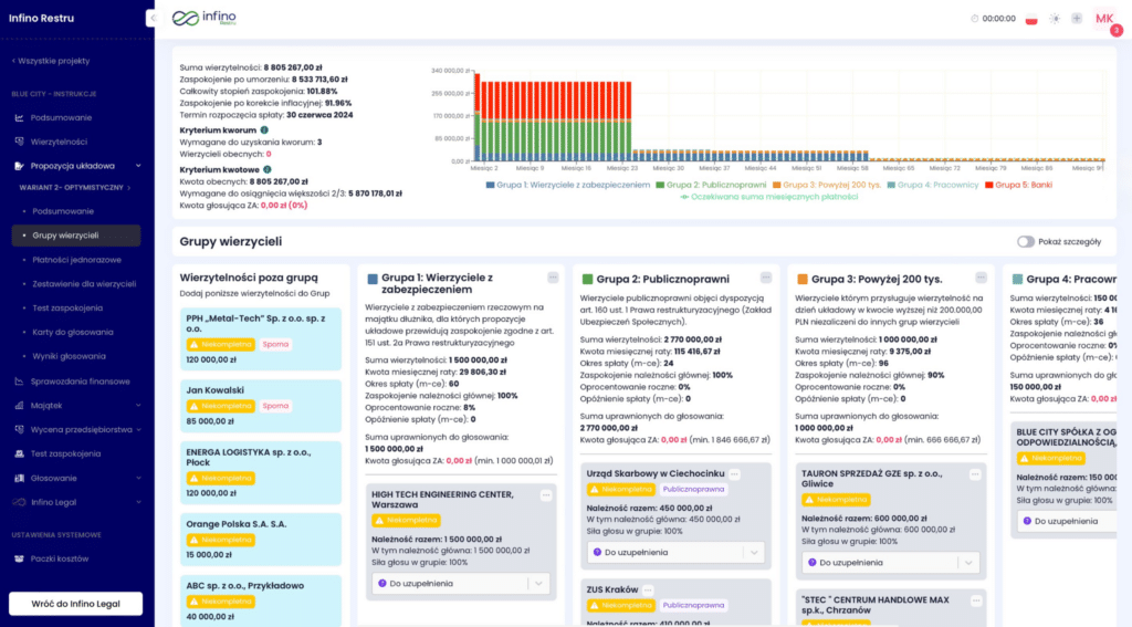 Dowiesz się, jak w module Infino Restru od podstaw stworzyć propozycję układową – od utworzenia nowego projektu, poprzez dodanie grup wierzycieli, konfigurację warunków spłaty, aż po symulację wyników głosowania.