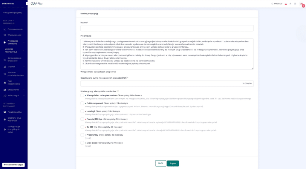 W module Propozycja układowa zbudujesz pełen plan restrukturyzacji – od układu grup wierzycieli po ostateczne zestawienie spłat. Skorzystaj z szablonu grup, aby przyspieszyć tworzenie nowych propozycji i eksperymentuj z parametrami, by znaleźć wariant możliwy do zaakceptowania przez wierzycieli i zgodny z realnymi możliwościami dłużnika.