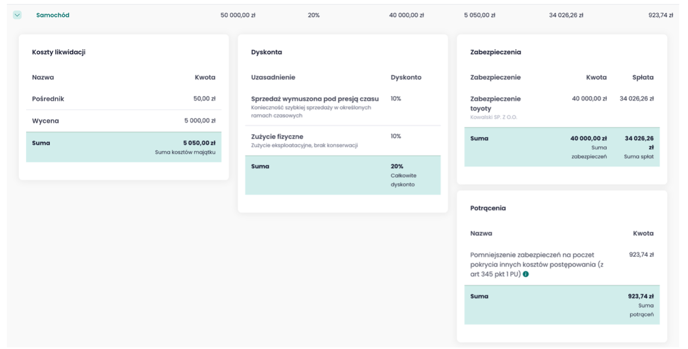 W dolnych częściach ekranu znajdziesz szczegółową listę zabezpieczeń wraz z informacją o ich wysokości, przypisaniu do składników majątku i estymowanej spłacie.